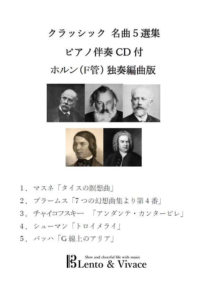 クラシックの名曲5曲を器楽独奏用に編曲しています。ピアノ伴奏CD付ですので、再生機があれば、いつでもどこでも一人で演奏を楽しめます。伴奏音源には、ガイドとなるメロディやクリック音は入っていませんので、発表会などでもご利用いただけます。そのため、演奏のし易いようにピアノ伴奏に原曲にはない前奏や一部ガイドとなる音を加えるなど編曲をしています。レント&ヴィヴァーチェは楽譜PDFと伴奏MP3データをセットにしてダウンロード販売しているサイトです。Yahooショッピングでは、楽譜を印刷し音楽データをCDに焼いて郵送販売をしています。(1)独奏用楽譜、(2)伴奏用楽譜、(3)伴奏CD をお送りいたします。ホームページではデモ演奏もお聞きいただけます。 曲目 1.マスネ「タイスの瞑想曲」 2.ブラームス「7つの幻想曲集より4番インターメッツォ」 3.チャイコフスキー「アンダンテ・カンタービレ」 4.シューマン「トロイメライ」 12.バッハ「G線上のアリア」 レント&ヴィヴァーチェのホームページでは、デモンストレーション演奏をご覧いただけ、他の曲目のダウンロード販売も行っています。