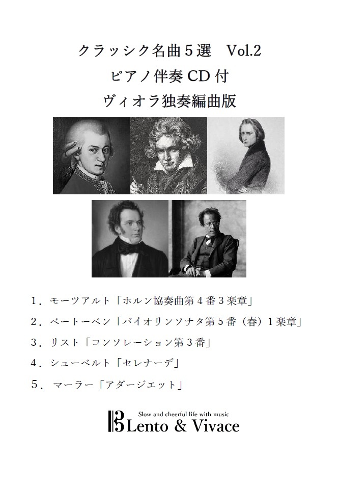 クラシックの名曲5曲を器楽独奏用に編曲しています。ピアノ伴奏CD付ですので、再生機があれば、いつでもどこでも一人で演奏を楽しめます。伴奏音源には、ガイドとなるメロディやクリック音は入っていませんので、発表会などでもご利用いただけます。そのため、演奏のし易いようにピアノ伴奏に原曲にはない前奏や一部ガイドとなる音を加えるなど編曲をしています。レント&ヴィヴァーチェは楽譜PDFと伴奏MP3データをセットにしてダウンロード販売しているサイトです。Yahooショッピングでは、楽譜を印刷し音楽データをCDに焼いて郵送販売をしています。(1)独奏用楽譜、(2)伴奏用楽譜、(3)伴奏CD をお送りいたします。ホームページではデモ演奏もお聞きいただけます。 曲目 1.モーツアルト「ホルン協奏曲第4番3楽章」 2. ベートーベン「バイオリンソナタ第5番(春)1楽章」 3.リスト「コンソレーション第3番」 4.シューベルト「セレナーデ」 5.マーラー「アダージエット」 レント&ヴィヴァーチェのホームページでは、デモンストレーション演奏をご覧いただけ、他の曲目のダウンロード販売も行っています。