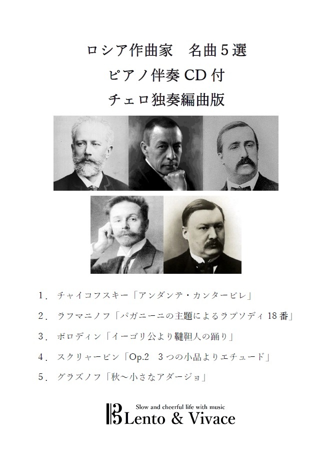 ロシアの作曲家の名曲5曲を器楽独奏用に編曲しています。ピアノ伴奏CD付ですので、再生機があれば、いつでもどこでも一人で演奏を楽しめます。伴奏音源には、ガイドとなるメロディやクリック音は入っていませんので、発表会などでもご利用いただけます。そのため、演奏のし易いようにピアノ伴奏に原曲にはない前奏や一部ガイドとなる音を加えるなど編曲をしています。レント&ヴィヴァーチェは楽譜PDFと伴奏MP3データをセットにしてダウンロード販売しているサイトです。Yahooショッピングでは、楽譜を印刷し音楽データをCDに焼いて郵送販売をしています。(1)独奏用楽譜、(2)伴奏用楽譜、(3)伴奏CD をお送りいたします。ホームページではデモ演奏もお聞きいただけます。 曲目 1.チャイコフスキー「アンダンテ・カンタービレ」 2.ラフマニノフ「パガニーニの主題によるラプソディ18番」3.ボロディン「イーゴリ公より韃靼人の踊り」 4.スクリャービン「Op.2 3つの小品よりエチュード」 5.グラズノフ「秋〜小さなアダージョ」 レント&ヴィヴァーチェのホームページでは、デモンストレーション演奏をご覧いただけ、他の曲目のダウンロード販売も行っています。