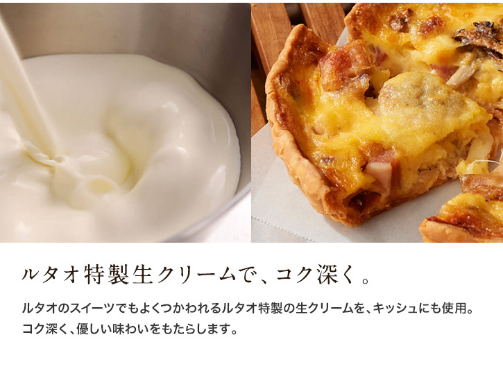 | 原材料名 | 生クリーム(国内製造)、全卵、豚肉、小麦粉、玉ねぎ、マーガリン、ナチュラルチーズ、舞茸、マッシュルーム、バター、食塩、菜種油、胡椒、ナツメグ/くん液、リン酸塩(Na)、乳化剤、香料、調味料(アミノ酸等)、発色剤(硝酸K、亜硝酸Na)、増粘多糖類、着色料(カロチン)、(一部に小麦・卵・乳成分・大豆・豚肉を含む) |