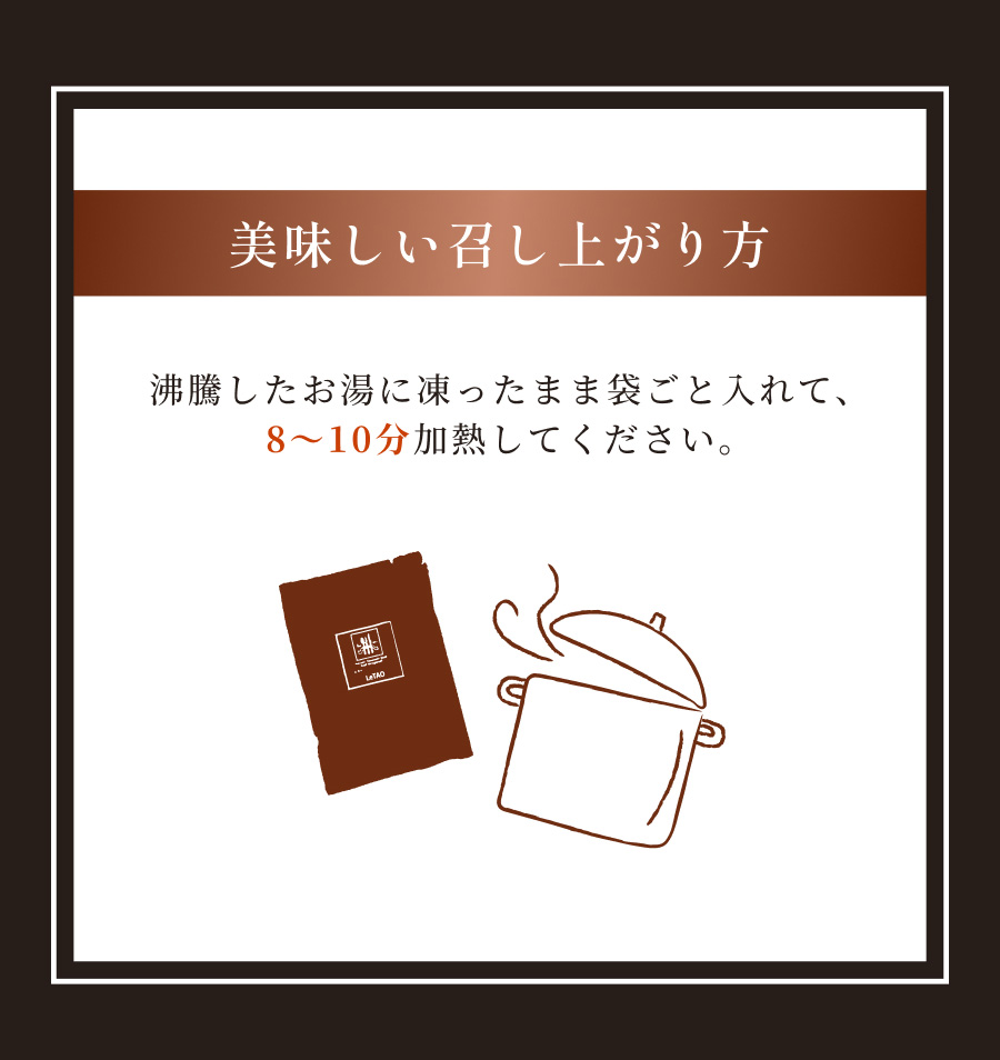 | 召し上がり方 | 沸騰したお湯に凍ったまま袋ごといれ、8〜10分加熱してください。 |