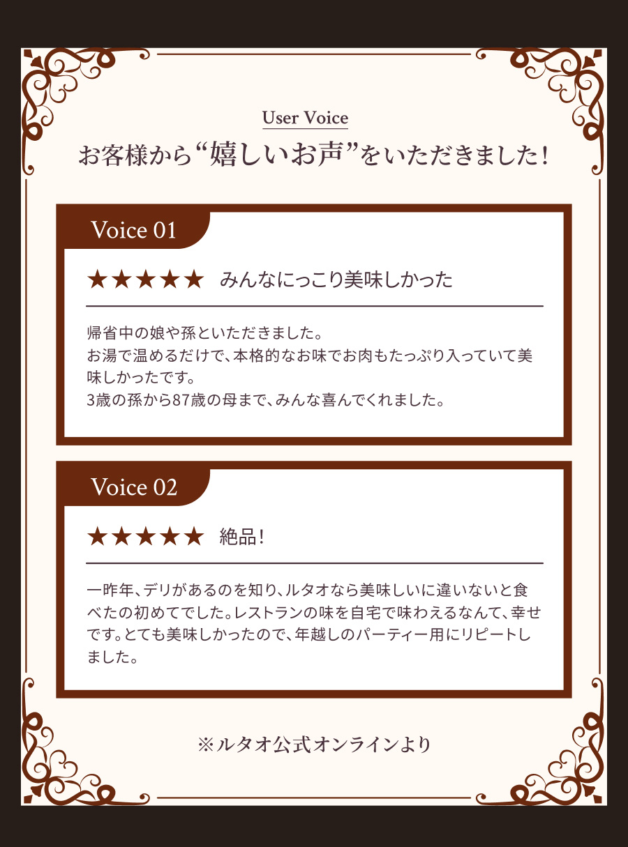 | 備考 | ※袋の端で手を切らないようにご注意ください。 ※加熱後は暑くなっておりますので、火傷にご注意ください。 ※開封後は1回で召し上がりください。 ※写真はイメージです。付け合せはございませんのでご注意ください。 パッケージ、付属のオーナメントなどは予告なく変更になる場合がございます。 |