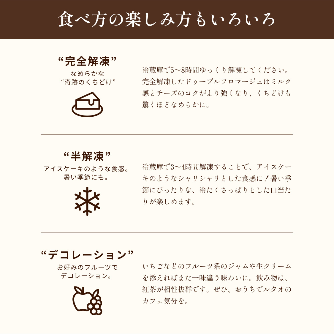 | 賞味期限 | ・賞味期限まで10日以上お日持ちするものをお届けいたします。 ・記載の賞味期限は冷凍状態の賞味期限です。 ・記載の賞味期限内に10℃以下の冷蔵庫内で解凍してください。 5-8時間で解凍されます。 解凍後は冷蔵庫に保存の上、解凍を開始してから48時間以内に召し上がりください。 |