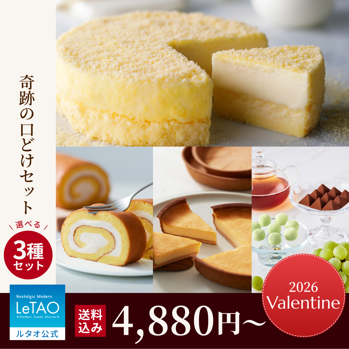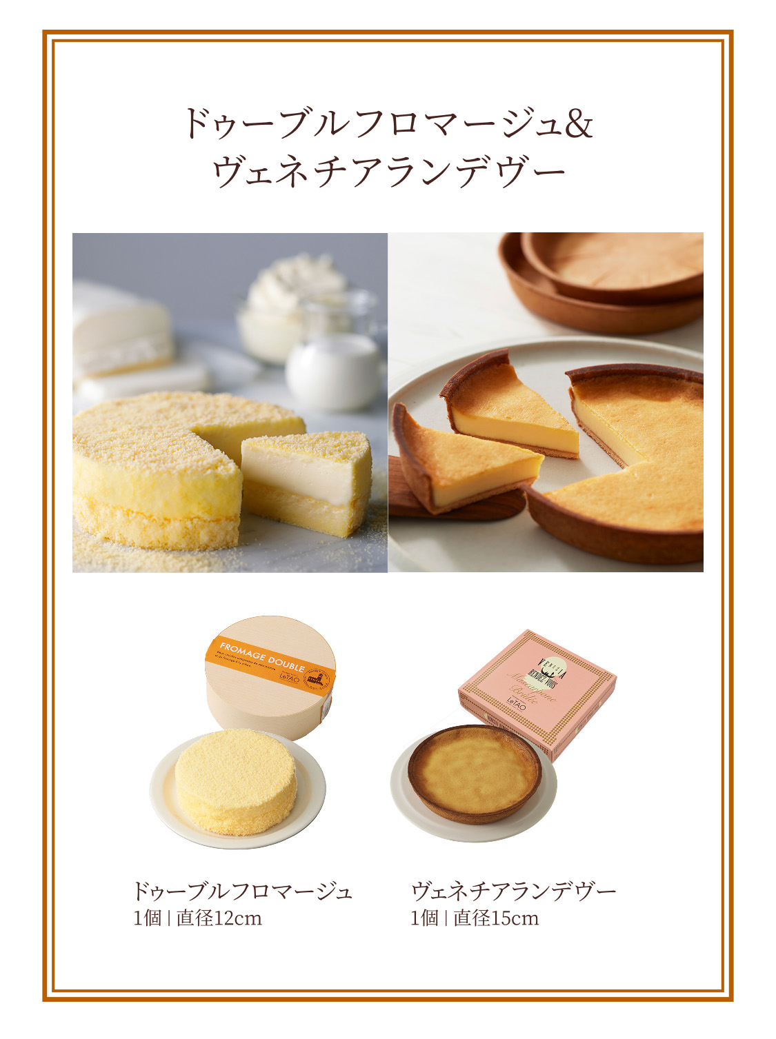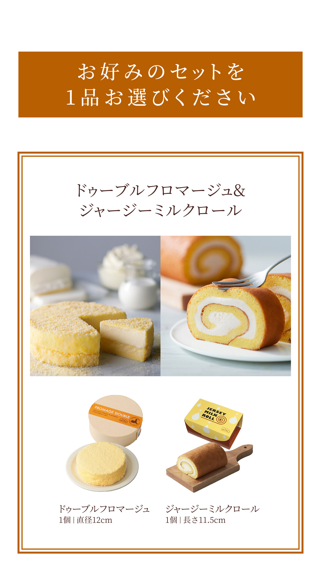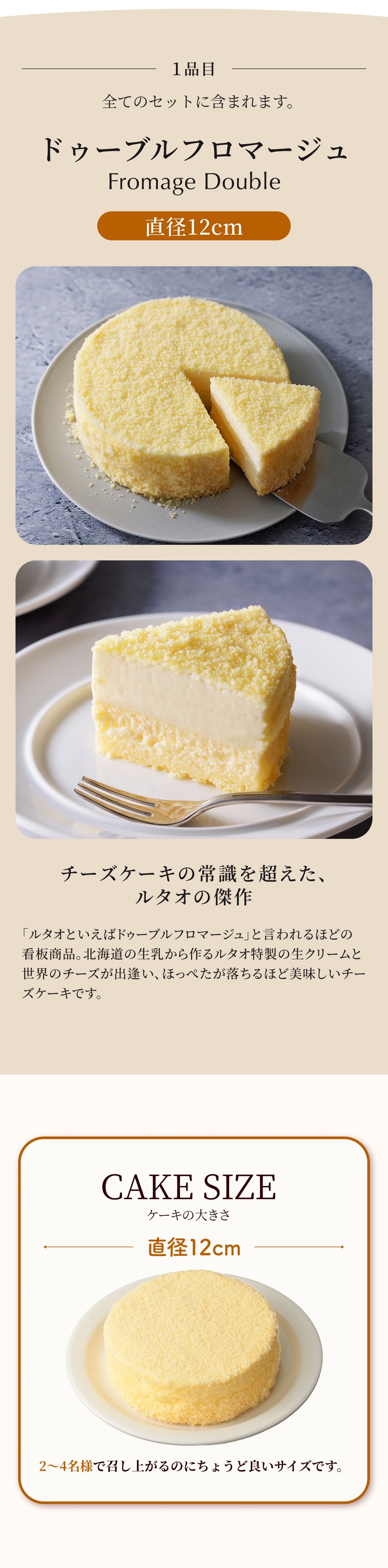 | 内容量 | 【固定商品】 ■ドゥーブルフロマージュ:1個(直径12cm) 【下記よりお選びください】 ■ジャージーミルクロール 1個(直径11.5cm) ■ヴェネチア ランデヴー 1個(直径15cm) ■レアチョコレートナイアガラ(8個入)&ロイヤルモンターニュ(9個入)1セット |