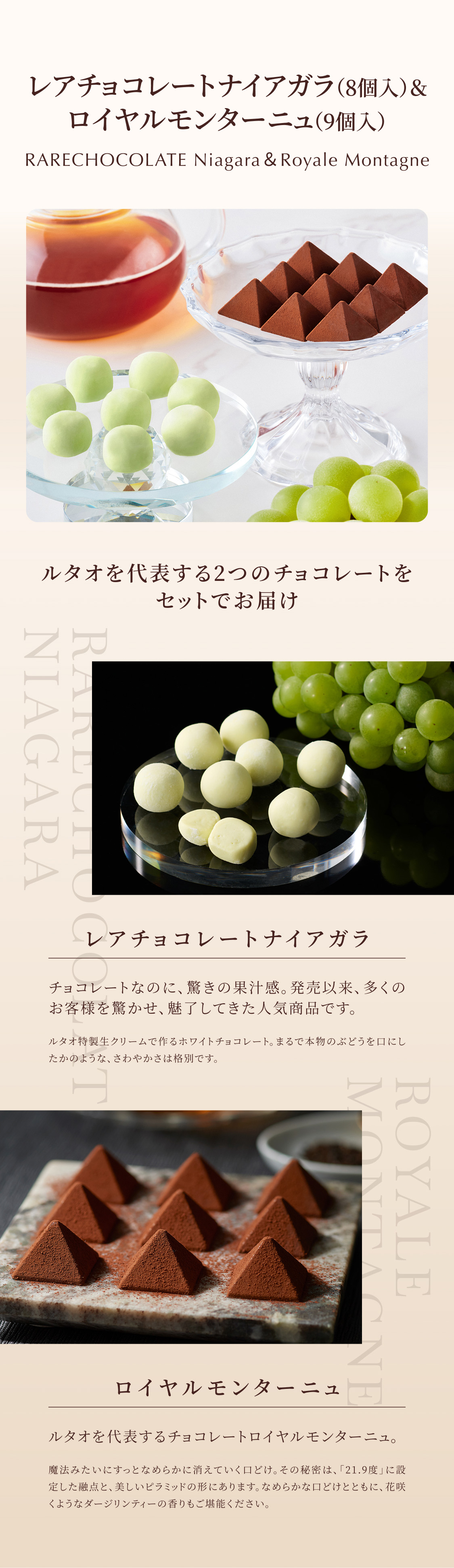 | 保存方法 | -18℃以下の冷凍庫で保存してください。解凍後は10℃以下の冷蔵庫で保存してください。■レアチョコレート ナイアガラ:10℃以下の冷蔵構内で保管してください。 ■ロイヤルモンターニュ:直射日光及び湿気を避け、20℃以下で保管してください。 |