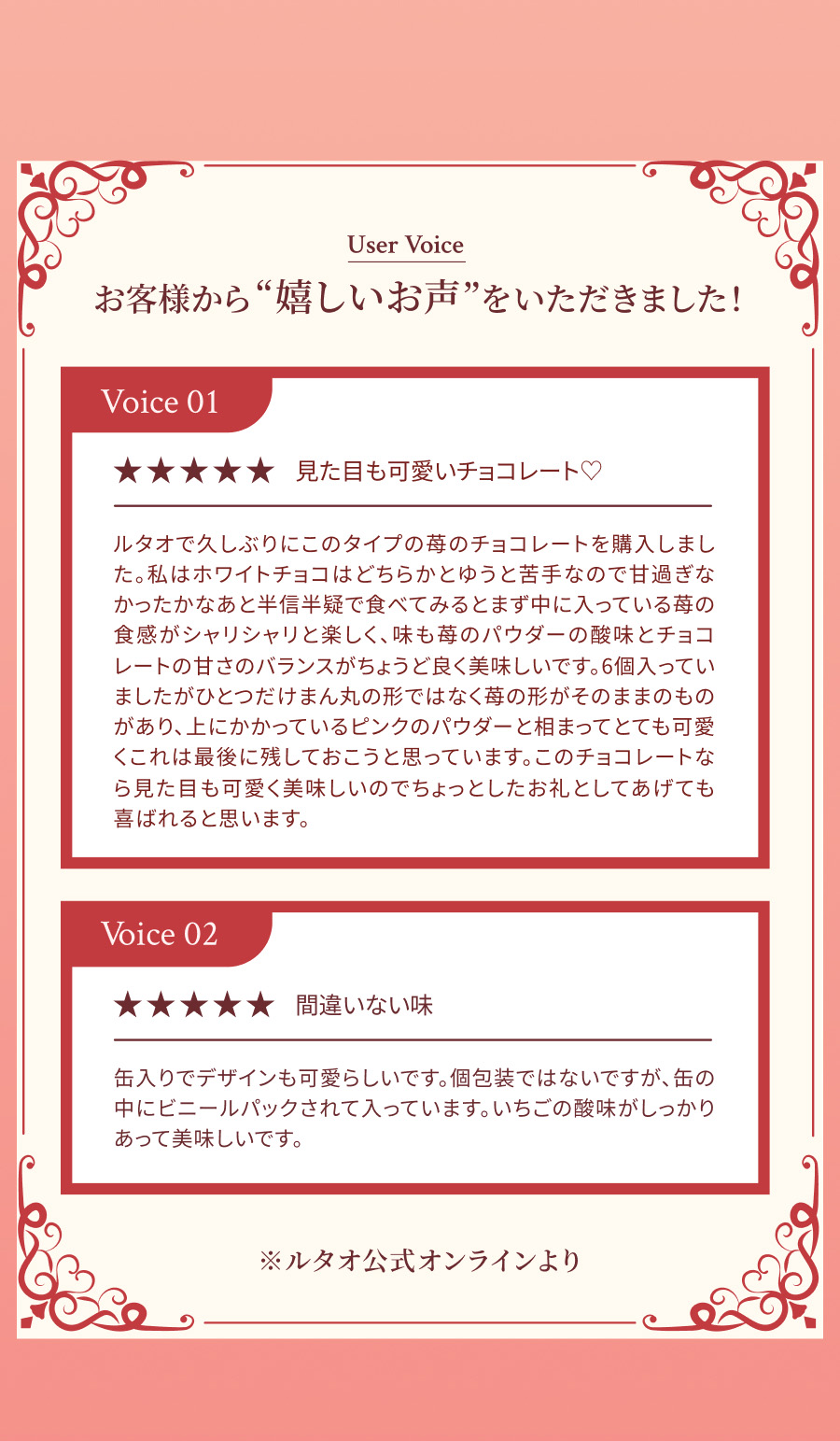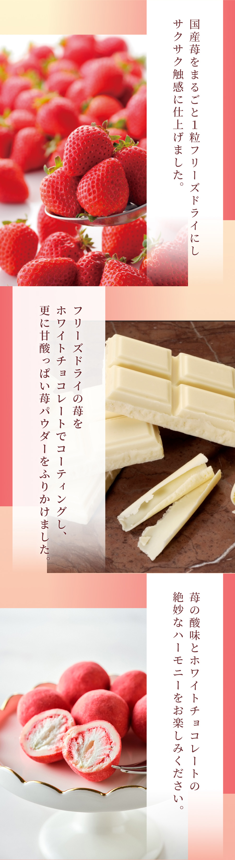 原材料名チョコレート(砂糖、ココアバター、全粉乳、植物油脂、乳糖)(国内製造)、乾燥苺(苺(国産))、乾燥苺粉末/甘味料(トレハロース)、乳化剤(大豆由来)、香料