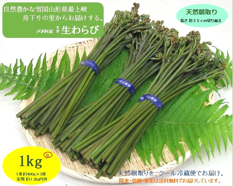 自然豊かな、雪国山形県最上峡舟下りの里〜今が旬の天然朝取り山菜(ワラビ1kg強)の、少し硬いとされる根元以外を(当店独自規格サイズ)約35cm程に切り揃え、新鮮クール冷蔵便でお届けしています。