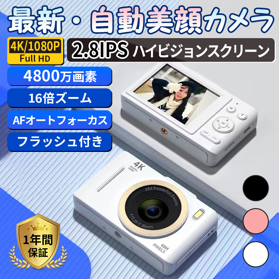 【正規品】 デジタルカメラ デジカメ 4800万画素 4K 美顔 2.8インチ 16倍ズーム 高画質 AF機能 動体検知機能 自撮り スマホ転送 手振れ補正 修学旅行 学生初心者