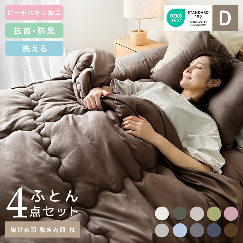 送料無料 抗菌 防臭加工 布団 4点セット ダブル 洗える ゆったり 210cm 布団セット 掛け布団 敷き布団 枕 抗菌 防臭 来客用 コンパクト ふとん 和洋 掛け敷きセットかわいい シンプル おしゃれ さらさら 肌触り ピーチスキン加工 中空ポリエステル 無地 新生活 カラフル シンプル ブラウン グレー ベージュ ブルー ピンク グリーン ネイビー ライトグレー ホワイト LUCK ラック