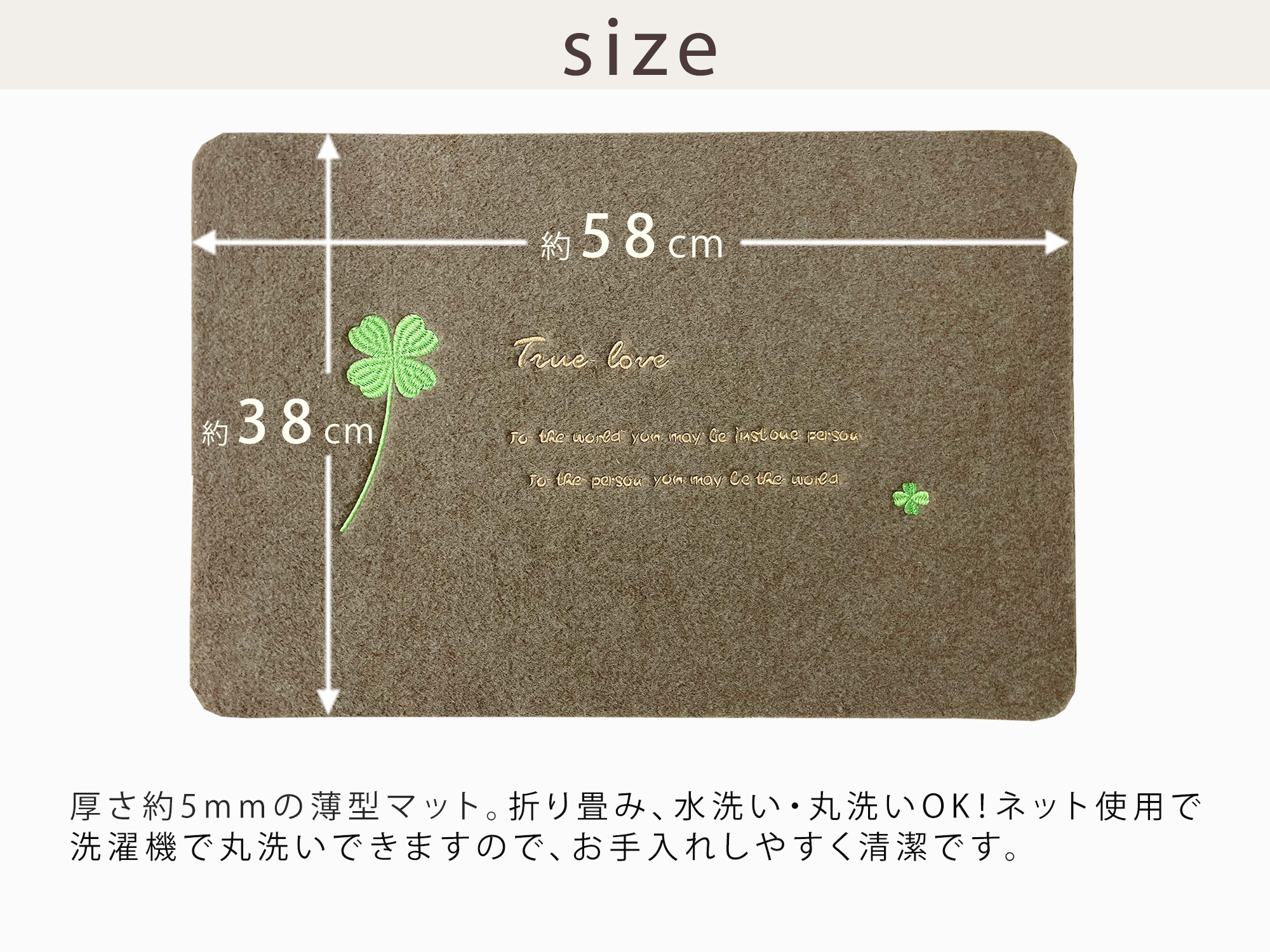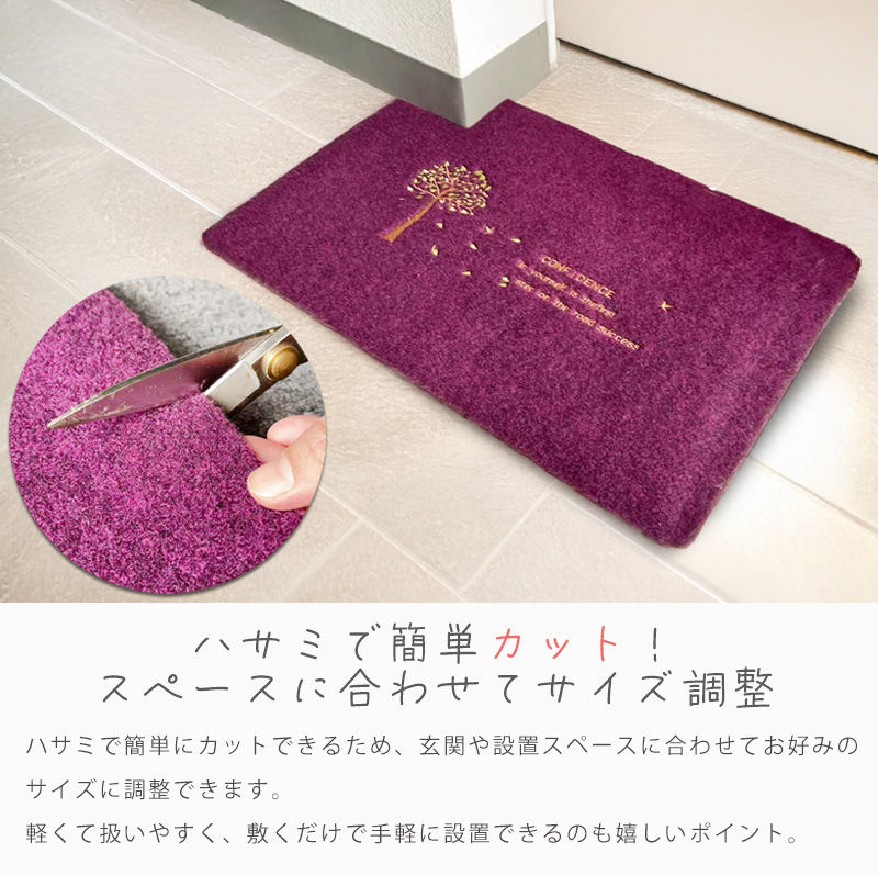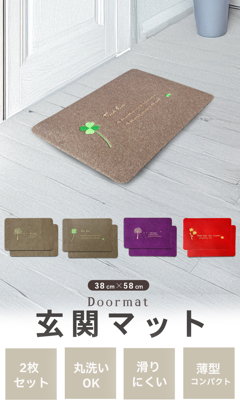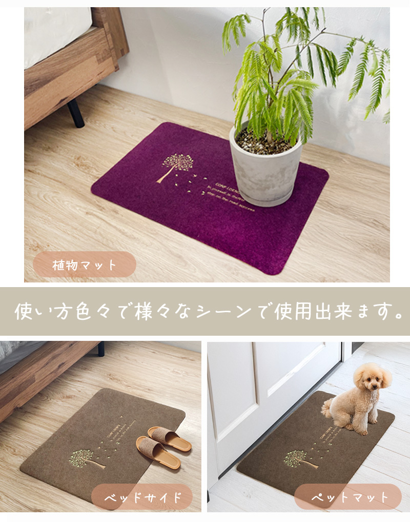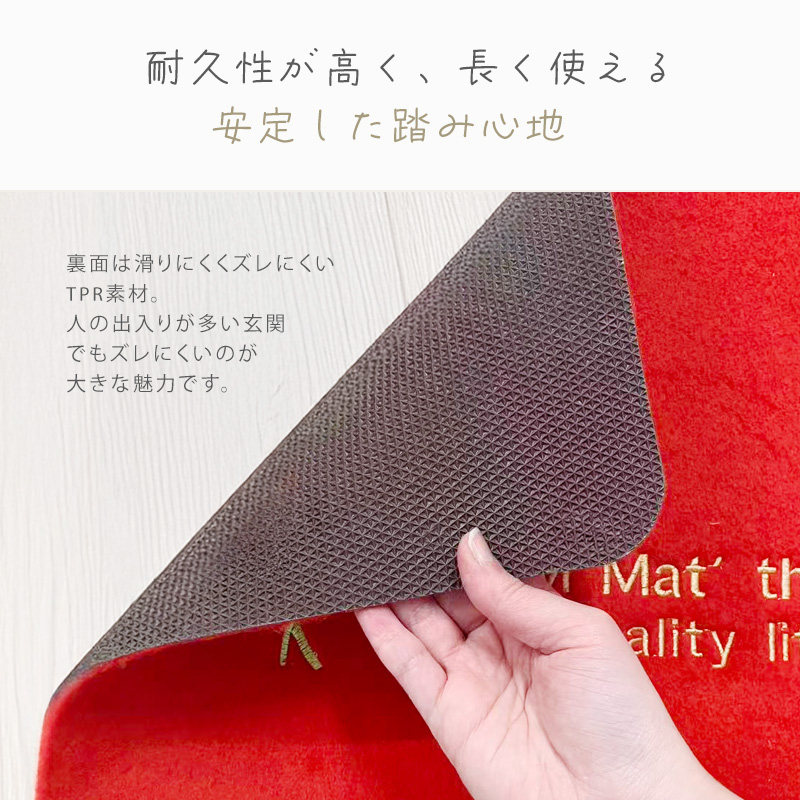| ご注意 | ■できるだけ実物と同じ色合いになるようにしておりますが、パソコンモニタの環境などによって実物と色合いが異なる場合がございますので予めご了承下さい。 ■転倒の恐れがございますので、滑りやすい箇所への設置にはご注意下さい。 ■マットの厚みは約0.5cmございます。予めドアを開閉した際の床との隙間をお測り下さい。 ■土や小石などが入った場合は、裏面から叩くなどしてから水で洗ってください。 ■丸洗いが可能ですが、洗剤やブラシを使用されますと刺繍がほどける場合がございます。 |