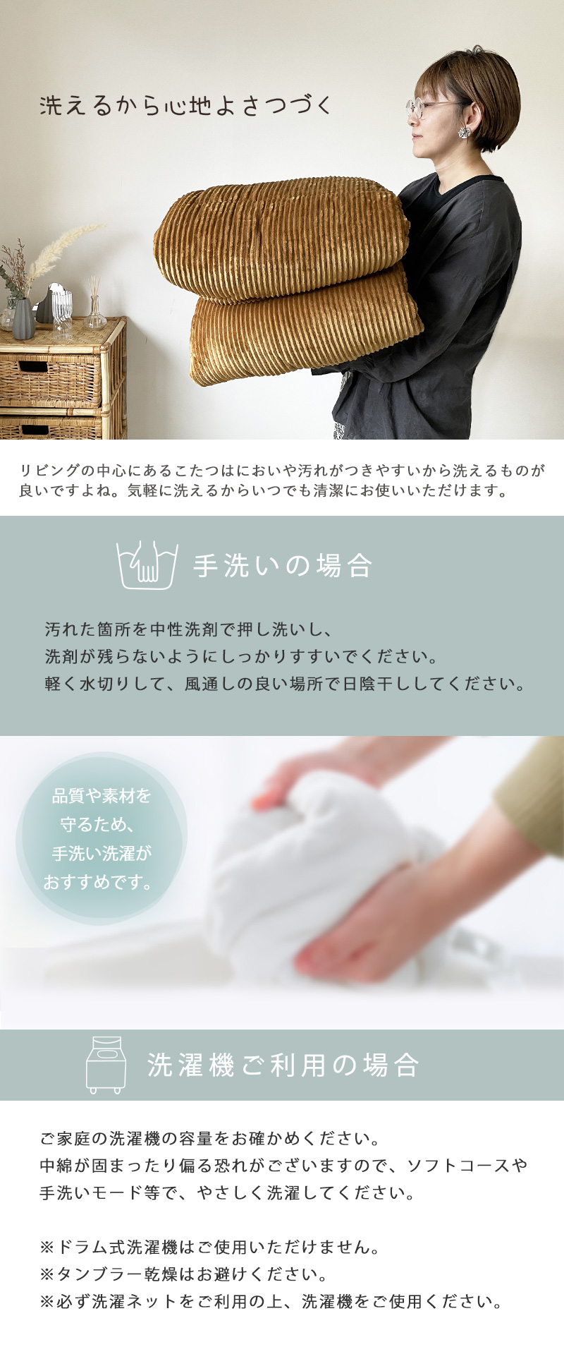 ※最初の洗濯の際は、多少の色落ちや毛羽落ちが考えられますので単独にてお洗いください。