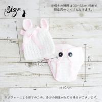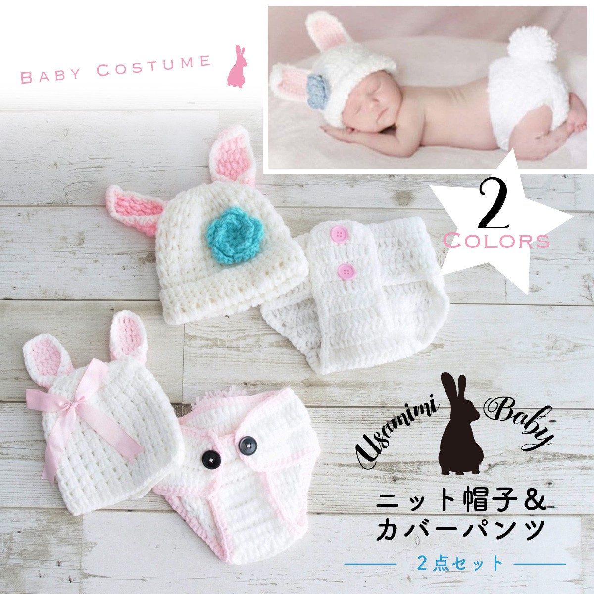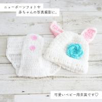 流行の新生児写真 ニューボーンフォトの衣装 コスチュームにオススメキュートなうさみみニット帽とカバーパンツのセット。優しい風合いで赤ちゃんにも安心。