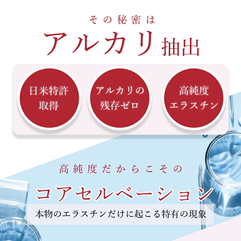 | 原材料名 | DHA 含有精製魚油(国内製造)、エラスチン、コラーゲンペプチド、アセロラ粉末、ビタミン含有酵母、食物繊維、食用酵母(亜鉛酵母、銅酵母、セレン酵母)/ゼラチン、グリセリン、ミツロウ、グリセリン脂肪酸エステル、クエン酸、力カオ色素、貝カルシウム、へマトコッカス藻色素 |