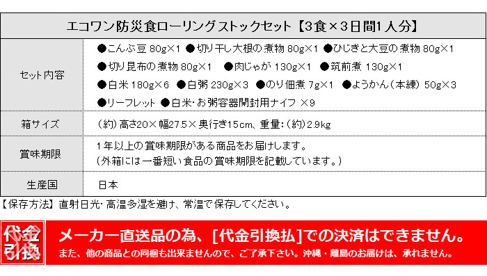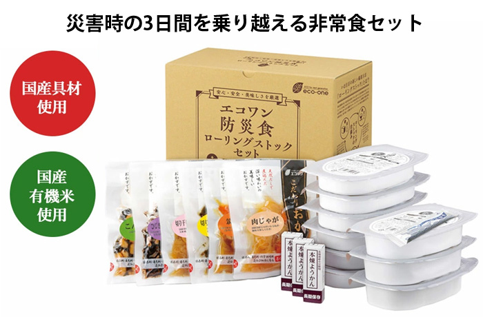防災食セット エコワン 和風ローリングストックセット 一人3食3日分 国産有機米使用 おかず 防災 非常 米 煮物 災害 保存料・着色料・うま味調味料不使用