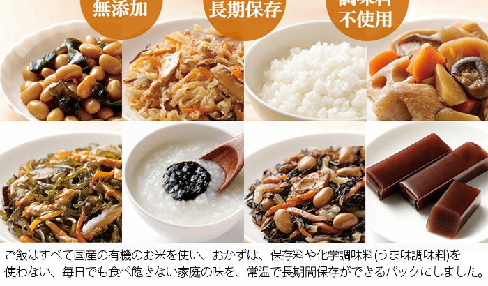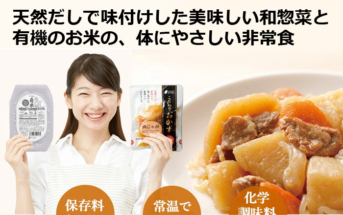 「備蓄用の防災食が欲しいけど添加物が心配…」そんな声から生まれた保存料や着色料、うま味調味料などを使っていない安心・安全な防災食セット。