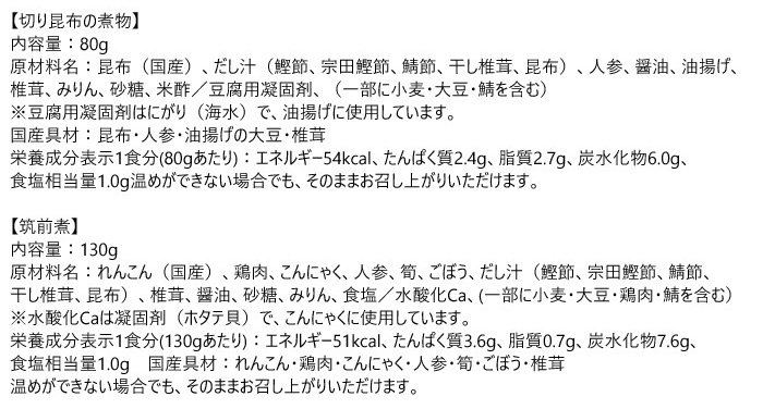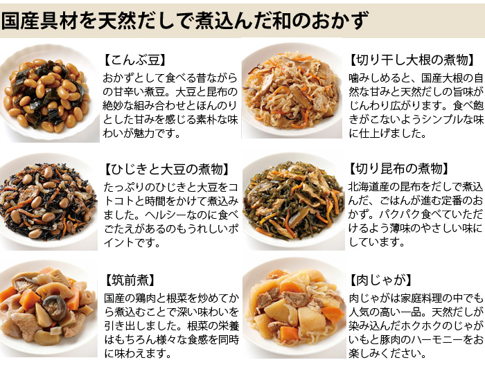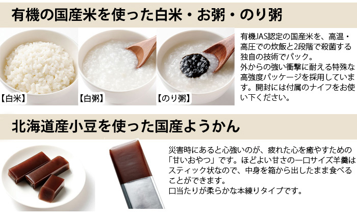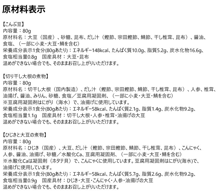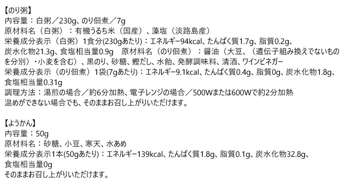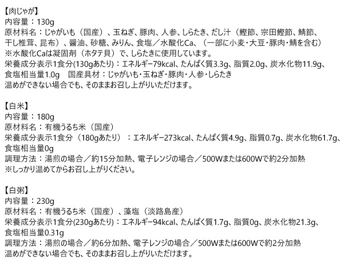 [セット内容/3食3日分]こんぶ豆・切り干し大根の煮物・ひじきと大豆の煮物・切り昆布の煮物→各80g1袋ずつ、筑前煮・肉じゃが 各130g1袋ずつ、白米 180g ×6パック、白粥 230g ×2パック、のり粥 230g ×1パック、ようかん(本練) 50g ×3本、リーフレット