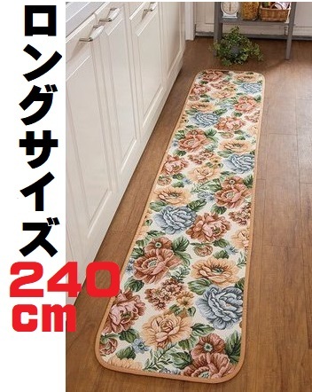 ロングキッチンマット 薔薇花柄240cm 洗える台所マット おしゃれ安いバラ柄 セール 廊下敷 カーペット