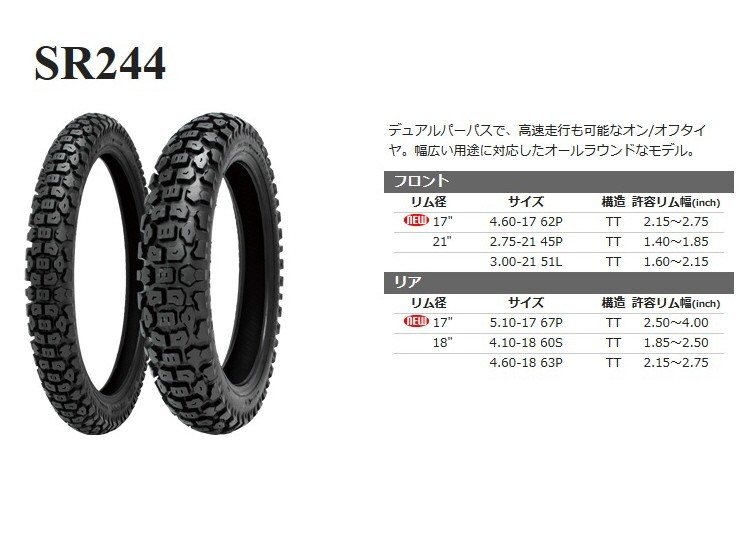 Shinko SR244 3.00-17 45P TT フロント&リア 許容リム幅(1.60-2.125)