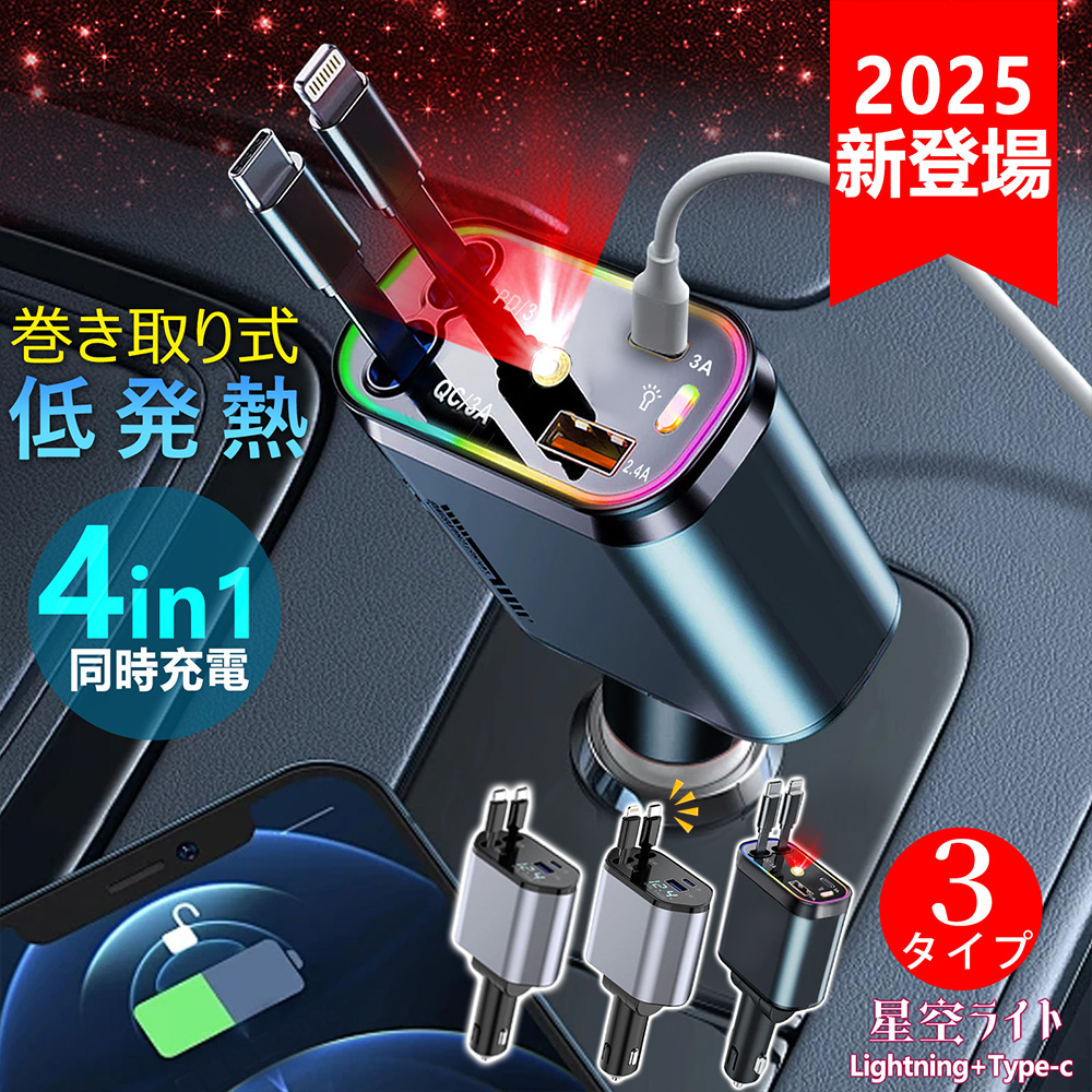 | 【4台のデバイスを同時に充電】 新版シガーソケットは、2USBポート+80cmの伸縮式ケーブル2本付き(MAX 100W)の高速充電を装備。4台のスマホ/タブレットを同時に充電できます。出張仕事、自分の運転、家族・グループ旅行など、多様なシーンで大活躍!高級感を感じさせるデザインと質感で、メタリックグレーのカラーリングが車内のインテリアにもぴったり! iPhone Lightning(5V/2.4A)とAndroid Type-C(9V/2A)の2本の巻き取り式充電ケーブルと、USB-Aポート(5V/2.4A)*1、USB-Cポート(5V/3A)*1の2つの急速充電ポートが付属していて、4台のデバイスを同時に充電できます。 【急速充電】 この車載充電器 QC3.0+PD対応で、Type-C ケーブル 急速充電合計最大100W/66W、Lightning ケーブル 急速充電合計最大20W。車 充電器 シガーソケット急速充電に対応したデバイスのみ急速充電が可能です。 【電圧計搭載】 車のバッテリーの電圧を常時表示。異常が発生してもすぐに気がつけます。 【緩みに強く、抜けにくい】 車の走行時に発生する、様々な振動を受けても、緩みにくいため、安定した充電を実現します。12V車・24V車 両方に対応。 【安心・安全なデザイン】 LEDデジタルディスプレイは、リアルタイムで電圧を検知し、電流異常時に自動的に電源をオフにし、常に機器の安全を守ります。過電流・過電圧・過熱・短絡に対する多重保護システムを搭載しているため、安全な充電ができます。プラグは非常にしっかりで、でこぼこ道を運転しても飛び出すことがなくて、安心して使用できます。 【保存しやすいカーチャージャー】 巻き取り式の充電ケーブルで、絡まることなく、車の散らかりにサヨナラ。ケーブルは3cmから80cmまで簡単に伸ばすことができ、プラグは180°柔軟な角度調節できるので、デバイスのリンクがしやすく、前・後座席両方の方とも快適に充電できます。 【ユニバーサル車載充電器&幅広い互換性】 USBカーチャージャーは、iPhone 15/14/13/12/11 Pro Max / 13 Mini / SE, Samsung Galaxy S23/S22/S21 Ultra / Note 9/8/7, AQUOS sense8/7 R8/7, Xperia 5/10 V, Google Pixel7/7a, iPad Air 2 / mini 4, iPad (vierte Generation), iPad Pro 10.5 Zoll/iPad Pro 12.9 Zoll (zweite Generation), Airpods 3 / Airpods Proなどすべてのスマートデバイスに対応。iPhone&Androidスマホ、タブレット、イヤホン、モバイル電源、スポーツウォッチなど100%の機器の充電に対応しております。 また注目点:このシガーソケット充電器はDC 12V~24Vの電圧の車に適用、ほぼ全てのシガーソケット装備車で使用可能です。 |