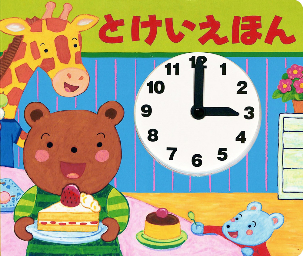 あさ起きてから、「おなかはグーグー」のおひる12じ、「みんなといっしょにたべるとたのしい」3じのおやつ、「さよならバイバイ」の5じ、そして「みかづきおつきさま」とねむる9じまで、とけいの針を回しながら、たのしく時間をおぼえられます。