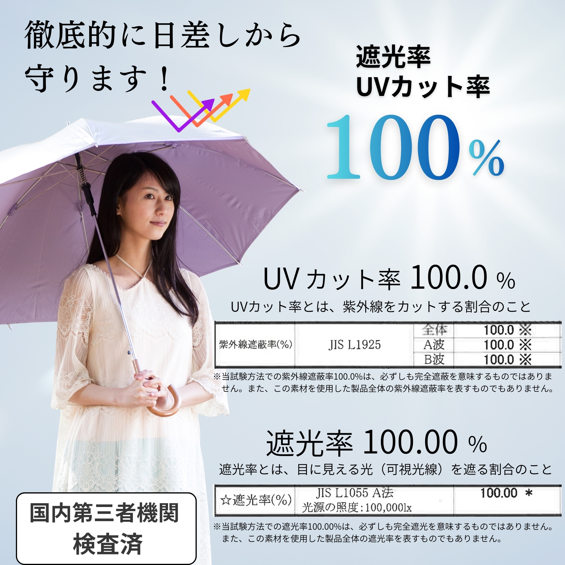 | ■以下の点をご確認の上お買い求めください。 1.生地の検査結果は「遮光率100.00%」「UVカット率100.0%」となりますが、一般財団法人カケンテストセンターの見解の通り「完全遮光」を意味するものではありません。また傘として仕上げておりますので、ミシン縫製による縫い目から光が差し込むことがあります。 2.生地の特性上、光が透けて見えるとても小さな穴(ピンホール)がある場合があります。これは製造工程上避けられないことで、ピンホールがあっても、雨が濡れることもありません。そのため僅かなピンホールは良品として販売しております。ご了承くださいませ。 3. 生地に撥水加工が施してありますので、雨の日も使える晴雨兼用タイプです。雨傘としてご使用になられた後は、乾かしてからおしまいください。 4.ポリウレタンコーティングの性質上、尖ったものや硬いものとの摩擦により、コーティングがはがれる恐れがあります。ご了承ください。 5.生地の特性上、開封時に素材の臭いが感じられる場合があります。数日のご使用や陰干しなどで自然に軽減されていきます。 |
