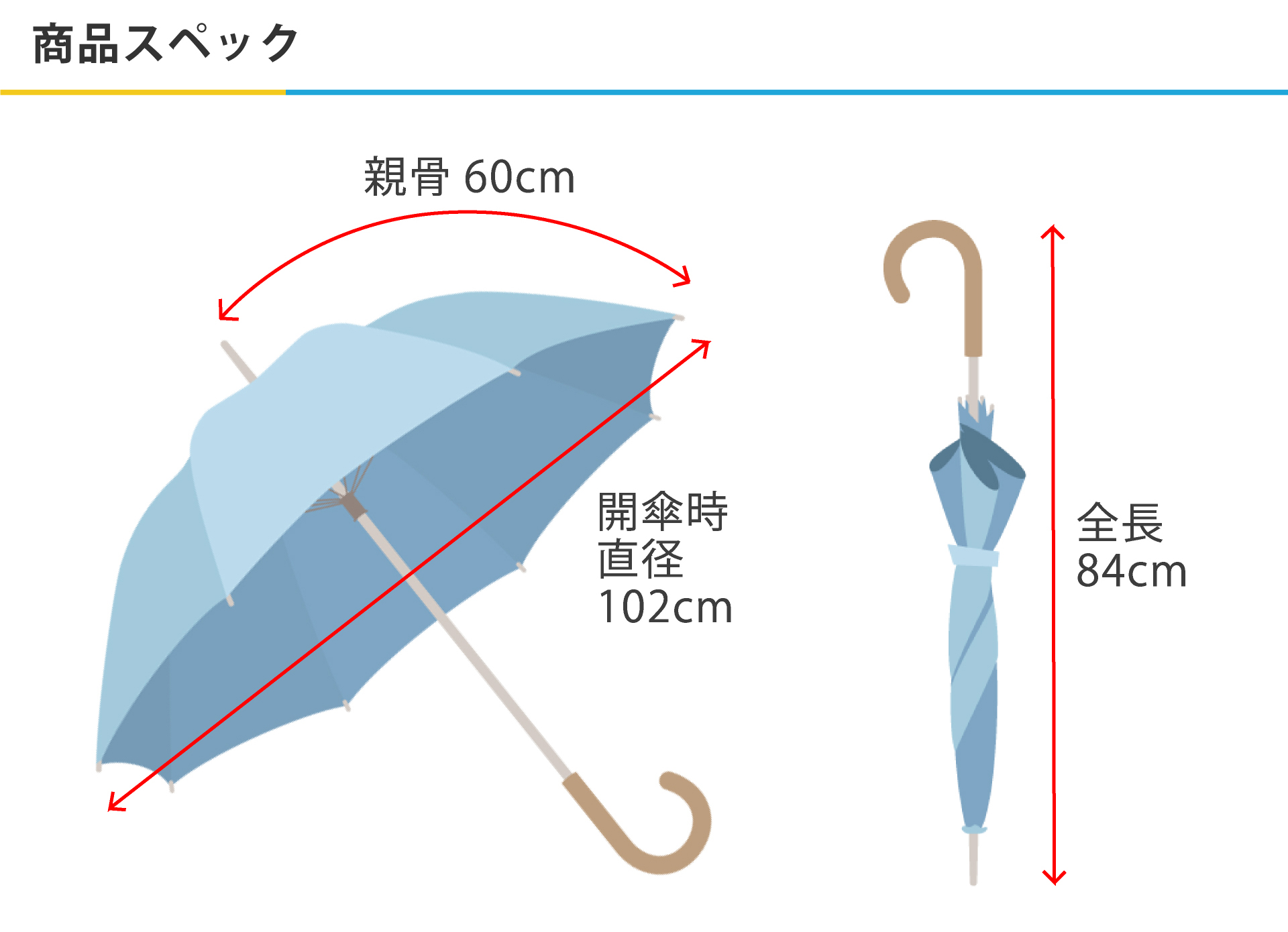■サイズ親骨:60cm×8本骨 全長:約84cm 開傘時直径:約102cm 重さ:約420g