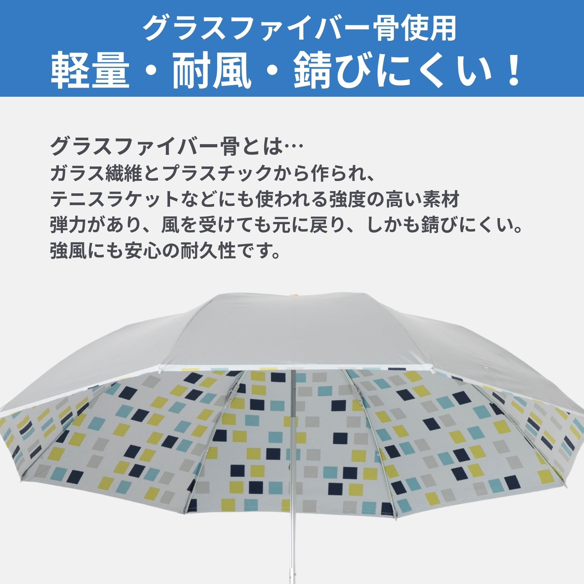 生地:ナイロン100%(ポリウレタンコーティング) 親骨:グラスファイバー 中棒:アルミ 手元:白/ABS樹脂製、茶色/木製