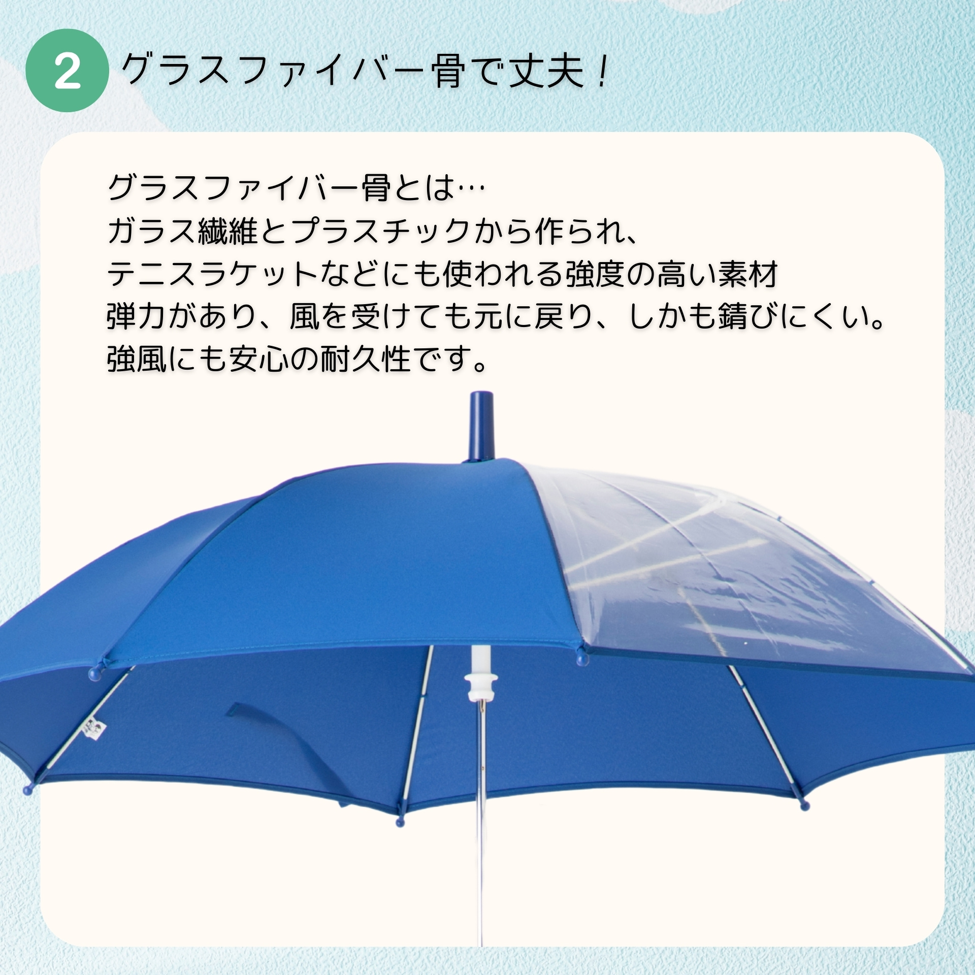 ■素材 生地:ポリエステル100% 透明部分 ポリエチレン 中棒:スチール 親骨:グラスファイバー 手元:ポリプロピレン