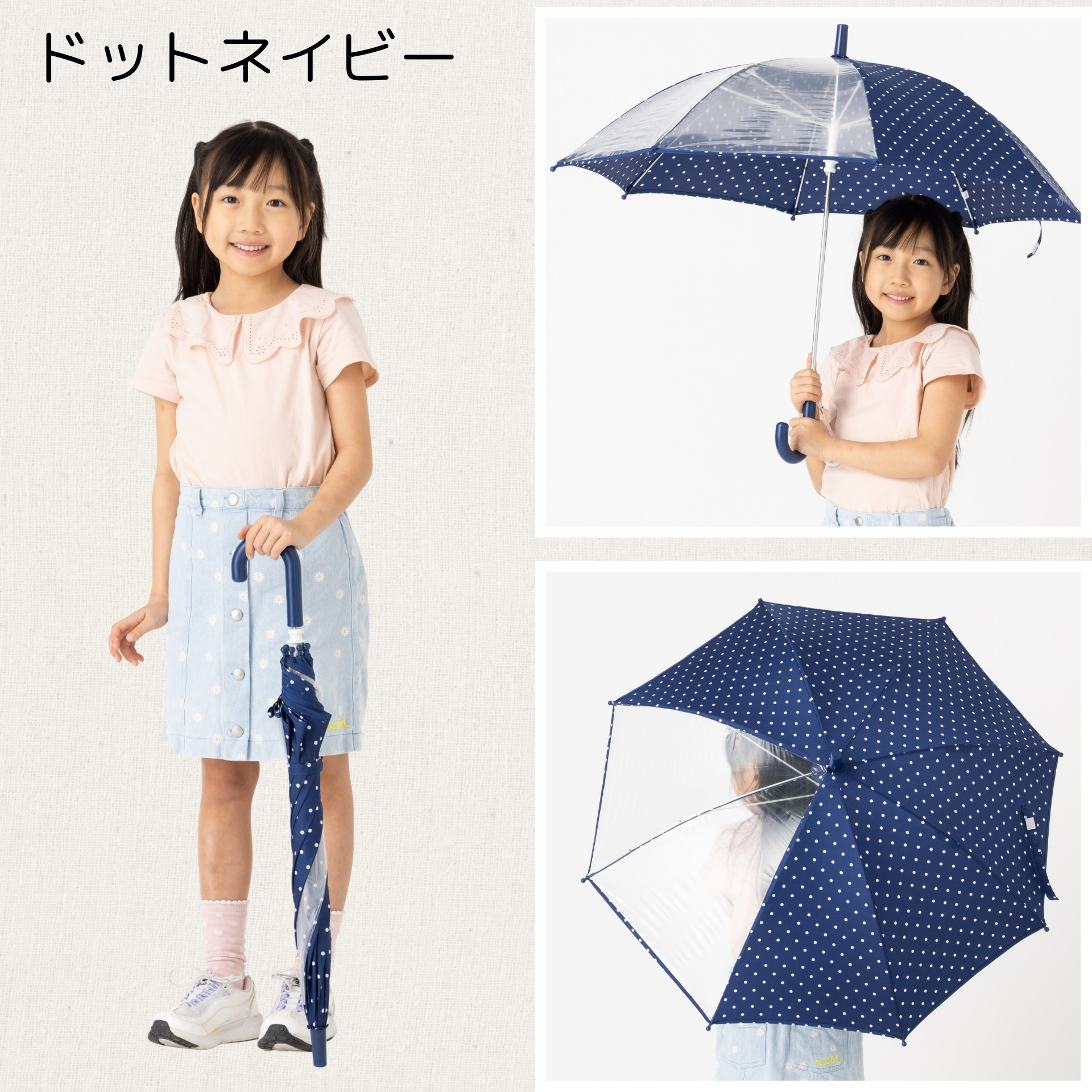 ■カラー:4色(透明×イエロー・透明×ネイビー・透明×ラベンダー・透明×ドットネイビー) 傘骨カラー:親骨 ホワイト・中棒 シルバー