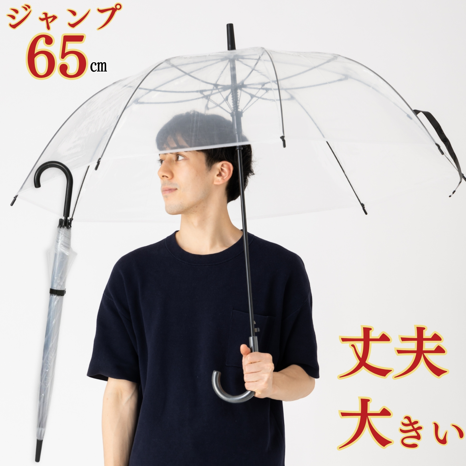 【2本セット】大きい 透明ジャンプ傘 ブラック 65cm×8本骨 ビニール傘