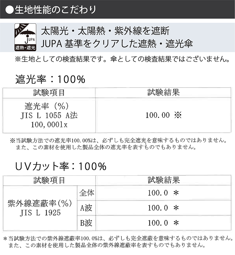 1.生地の検査結果は「遮光率100.00%」となりますが、一般財団法人カケンテストセンターの見解の通り「完全遮光」を意味するものではありません。商品添付のタグ表示には「1級遮光生地使用、遮光率99.99%以上」としています。また傘として仕上げておりますので、ミシン縫製による縫い目から光が差し込むことがあります。