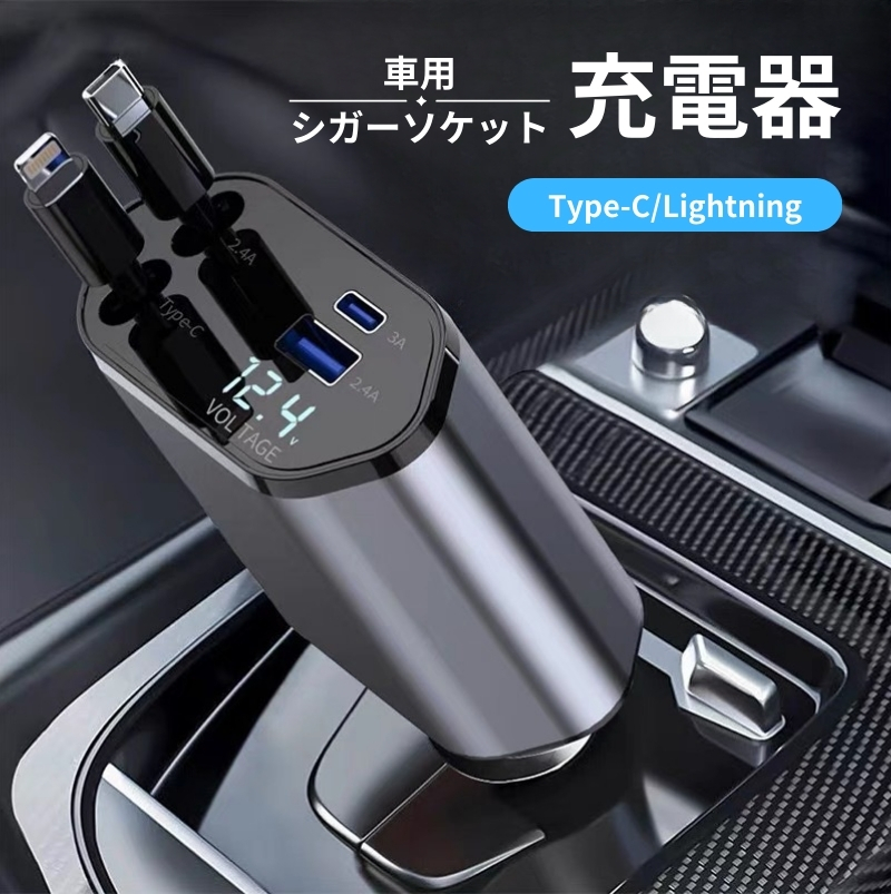 シガーソケット usb カーチャージャー 急速 充電器 車用 iphone typec lightning スマホ 巻き取り リール式 伸縮ケーブルシガーソケット カーチャージャー