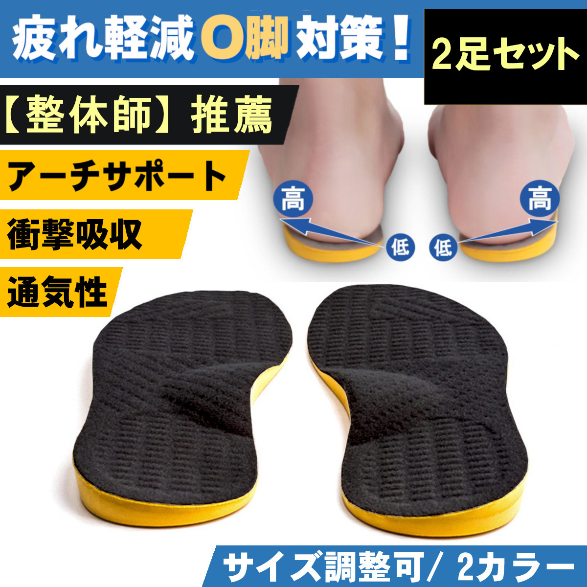 O脚矯正インソール 2足セット インソール 中敷き O脚 疲れない 衝撃吸収 XO脚 扁平足 土踏まず アーチサポート 足底筋膜