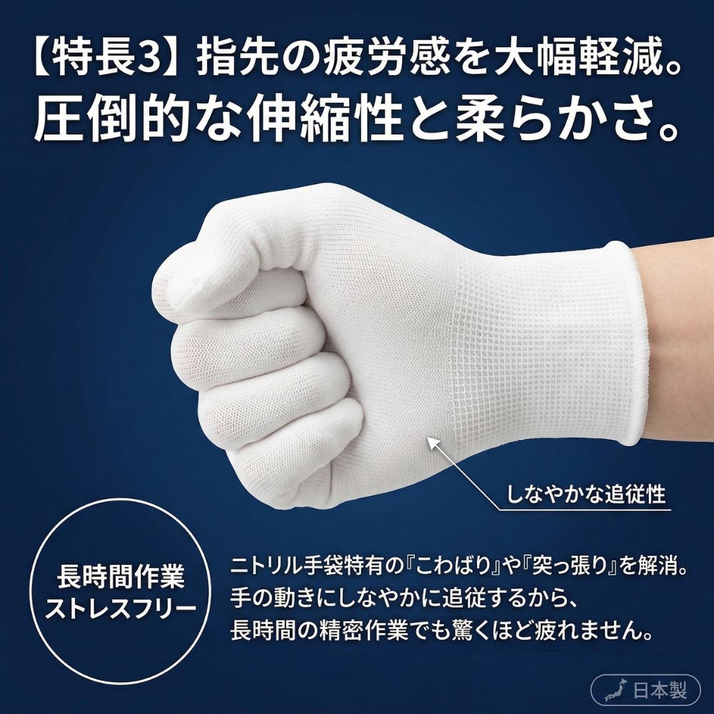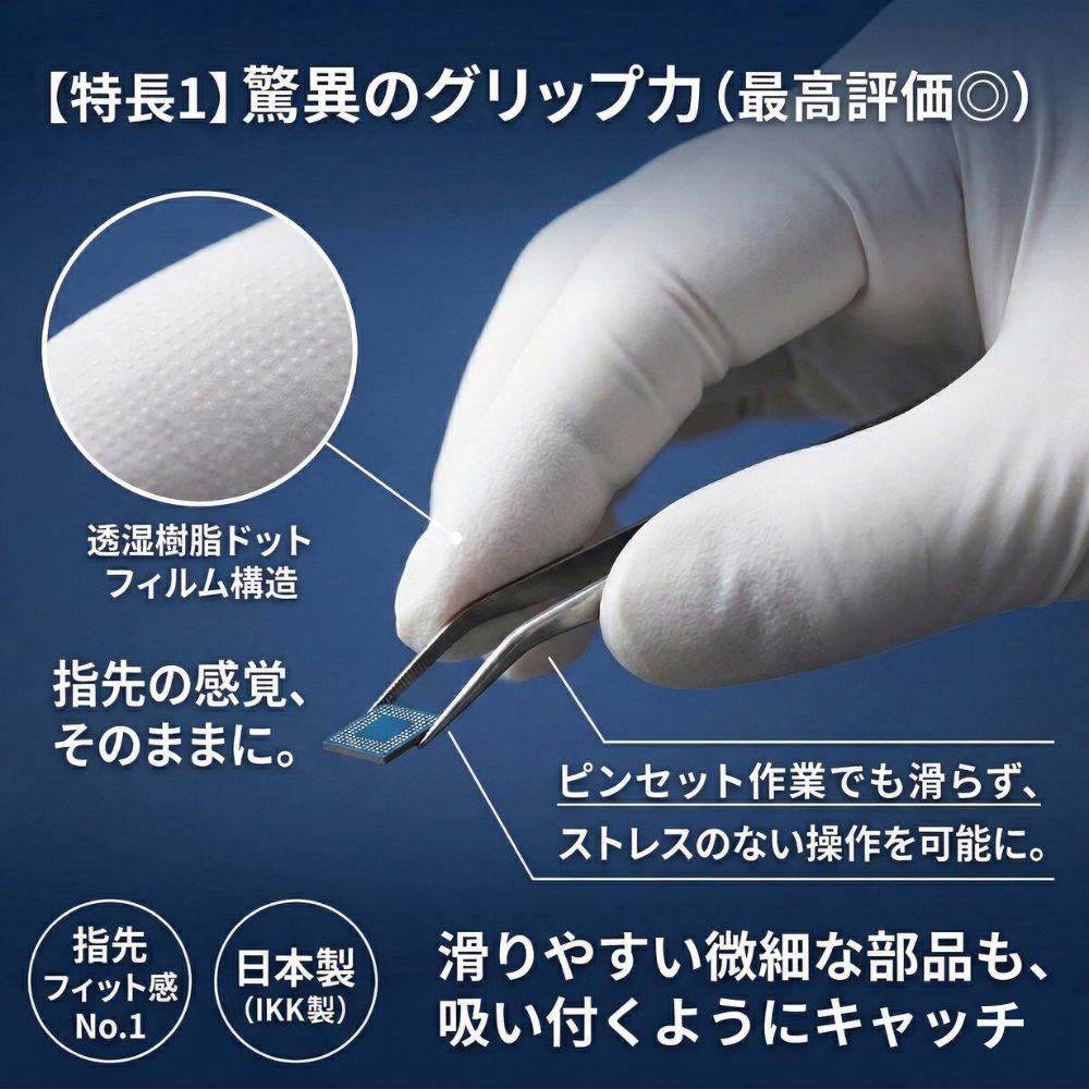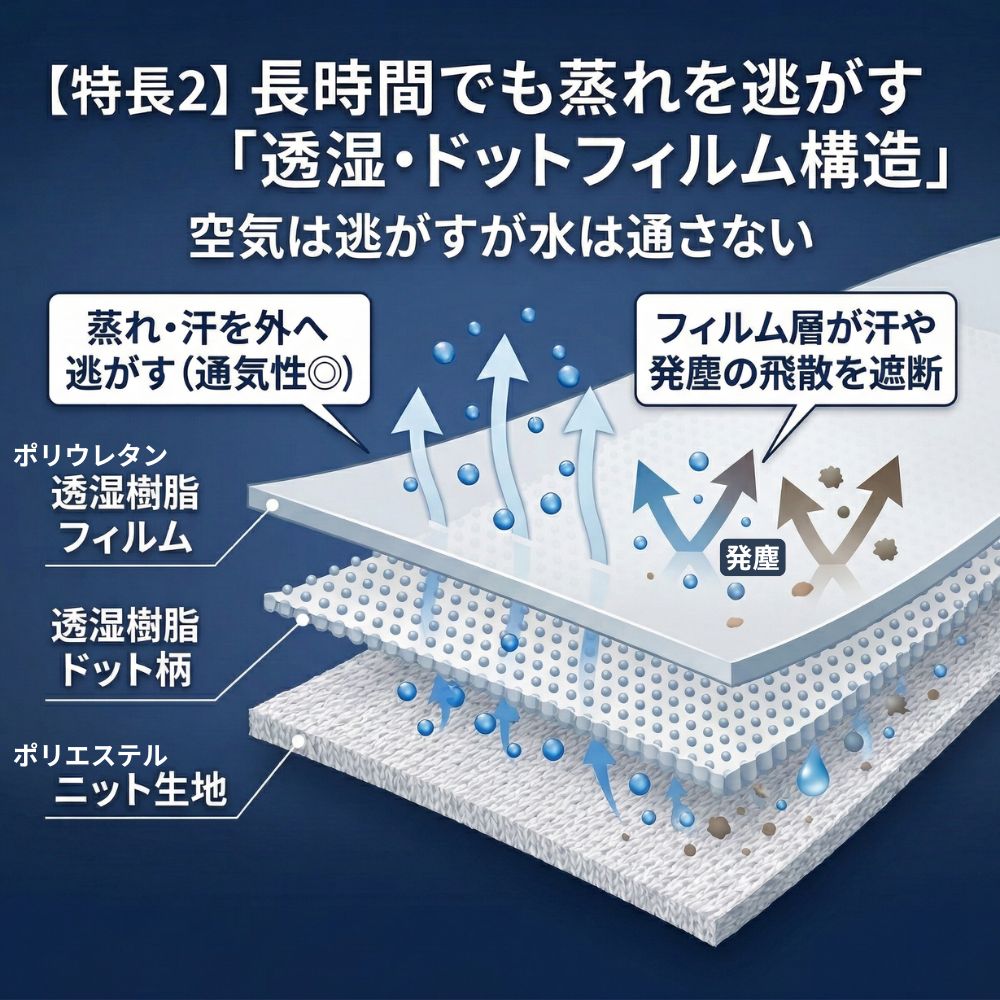 ゴム膜で完全に密閉してしまうニトリル手袋に対し、本製品は「水蒸気(気体)だけを通す」特殊な透湿樹脂フィルムを採用しています。