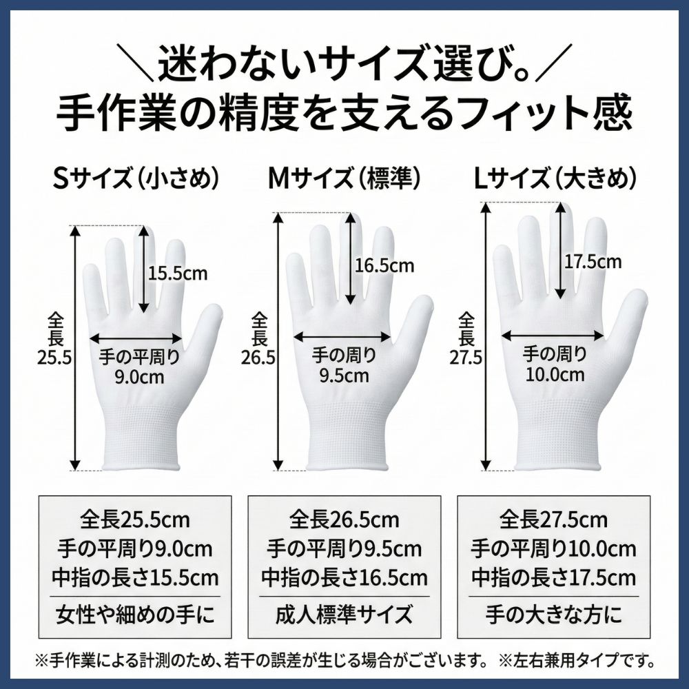 L(大きめ):全長 27.5cm、手のひら周り 10cm、中指の長さ 17.5cm