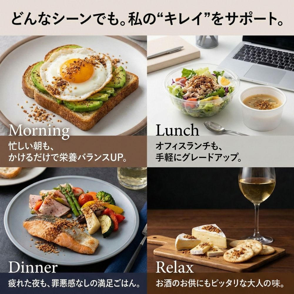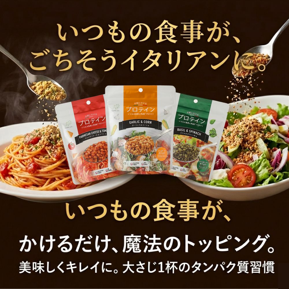 サラダ、スープ、パスタ、炒め物など、いつもの料理にそのままかけるだけで、手軽にたんぱく質を補給できます。