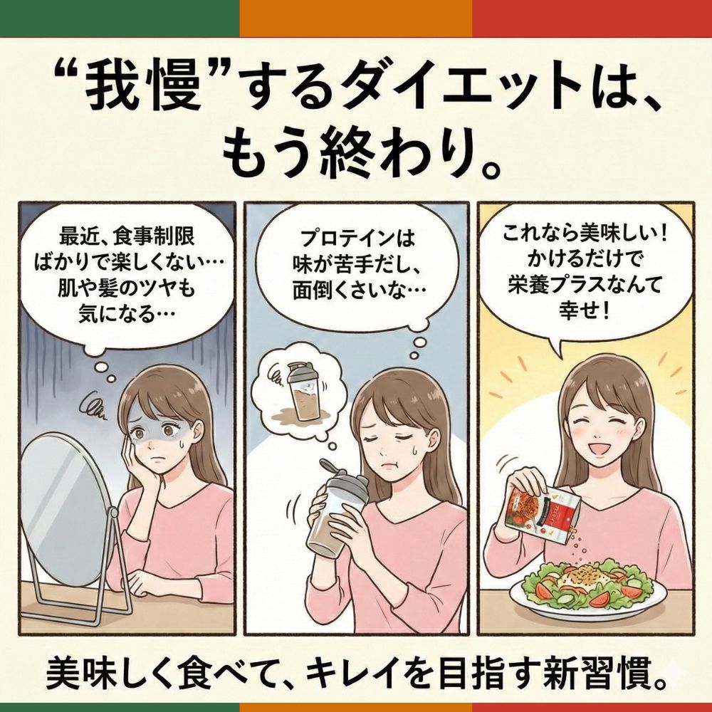 忙しい毎日の食事に、「かけるだけ」でたんぱく質をプラスできる、新しいスタイルのプロテインです。