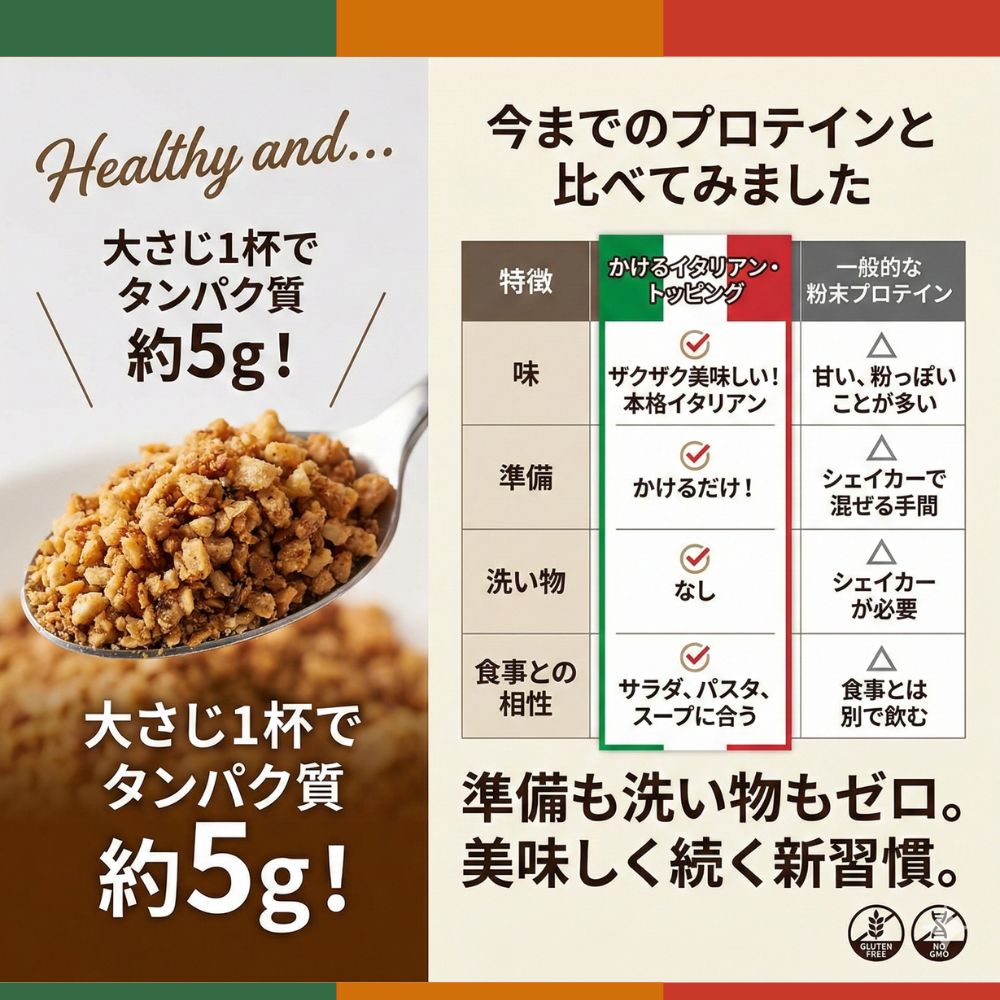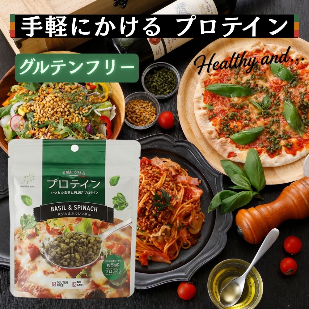 手軽にかけるプロテイン ( バジル&ホウレン草 ) 料理にかけるだけ たんぱく質補給 粒状タイプ グルテンフリー NON-GMO 大さじ山盛り1杯で約5g プロテイン