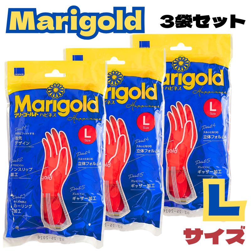 (3袋セット) マリーゴールド ゴム手袋 Lサイズ ハピネス キッチングローブ レッド 赤 ロングセラー 手袋 天然ゴム Marigold オカモト L 3双