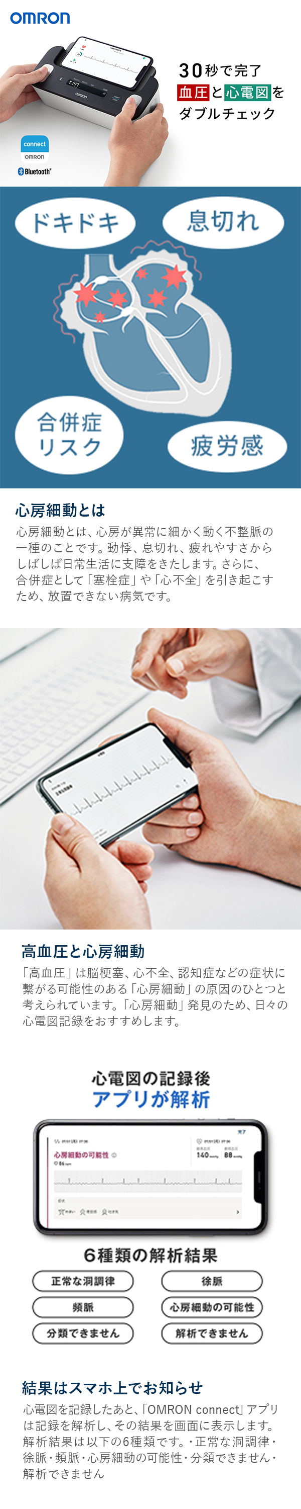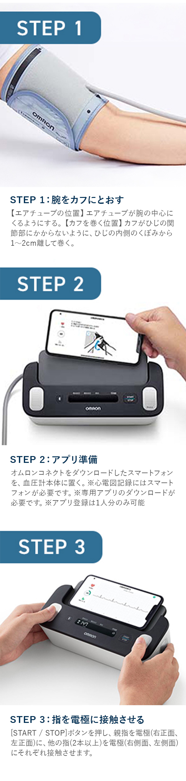 | OMRON connectアプリについて | オムロンコネクトアプリをご利用になる場合は、対応するスマートフォンとOMRON connectアプリ(無料)のインストールが必要です。 対応するスマートフォンの機種・OSバージョン一覧は、オムロンヘルスケアホームページにてご確認いただけます。 |