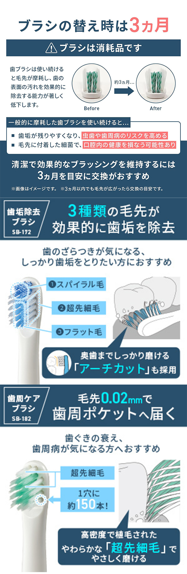 | 付属品:ブラシ(各1本) | 歯垢除去ブラシ、歯周ケアブラシ(HT-B318のみ) |
