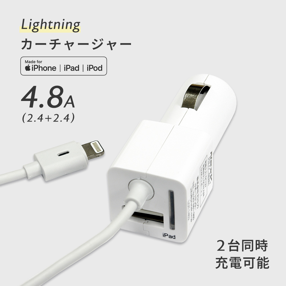 コンパクトなライトニングケーブル付属のカーチャージャー