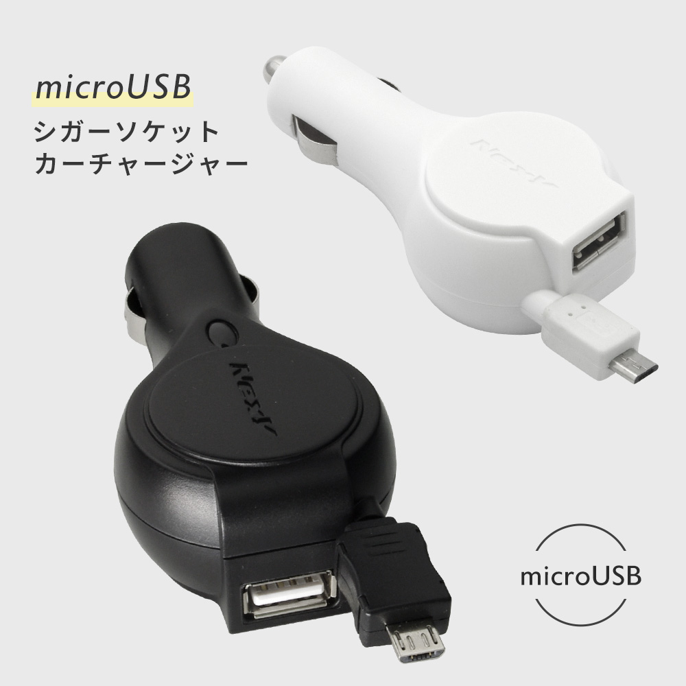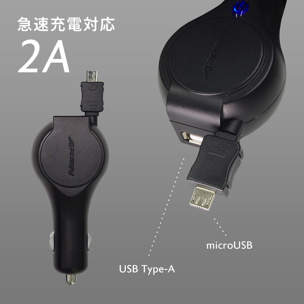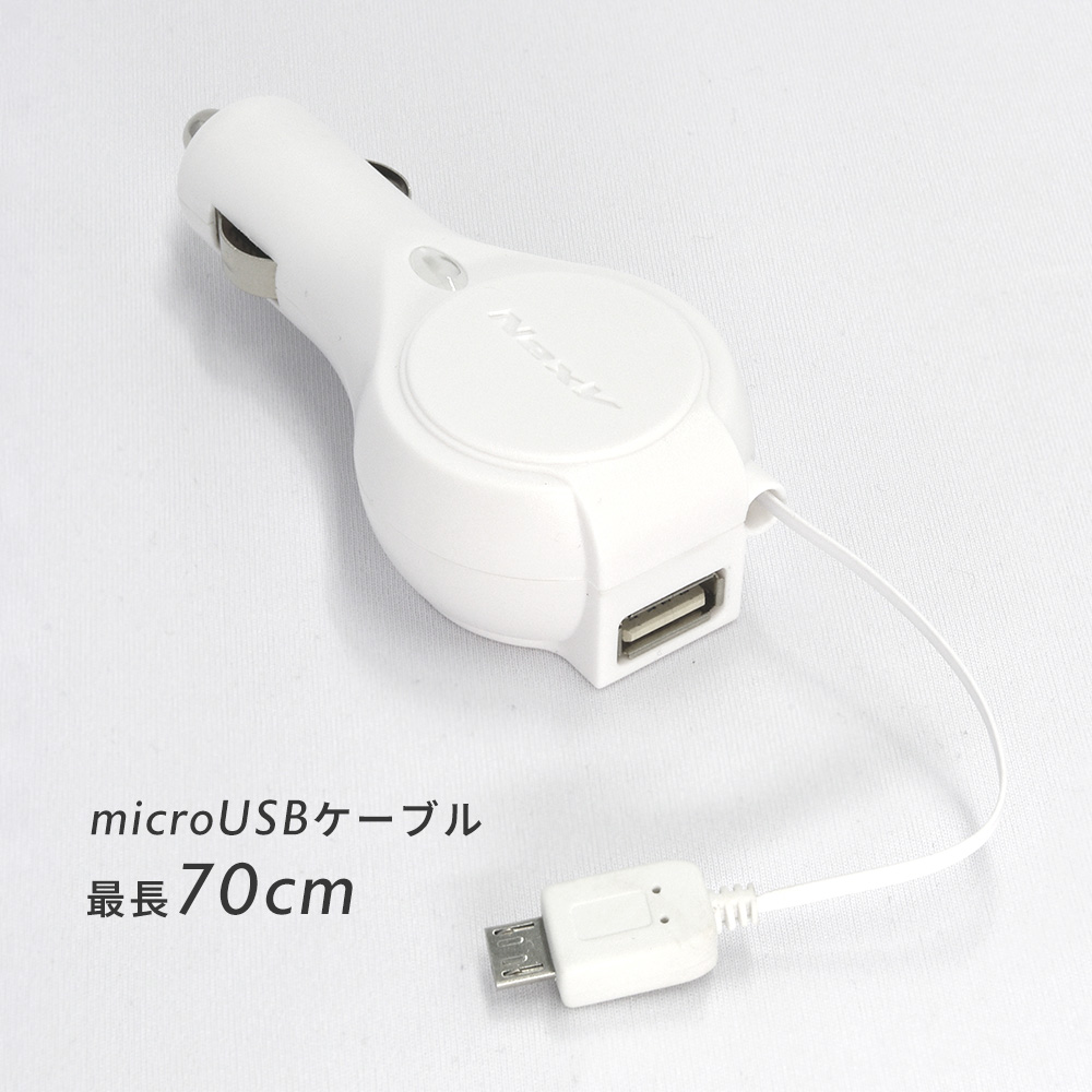 巻き取り式でコンパクトなmicroUSBケーブル付属のカーチャージャー