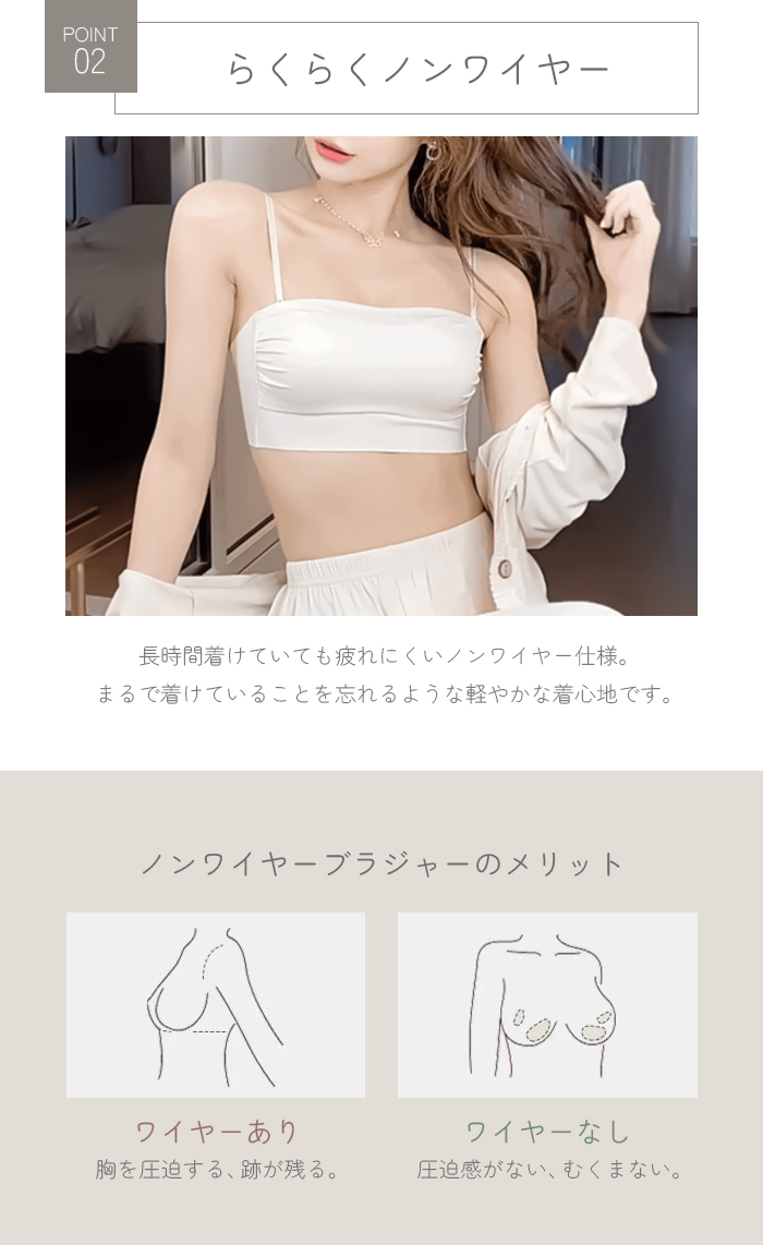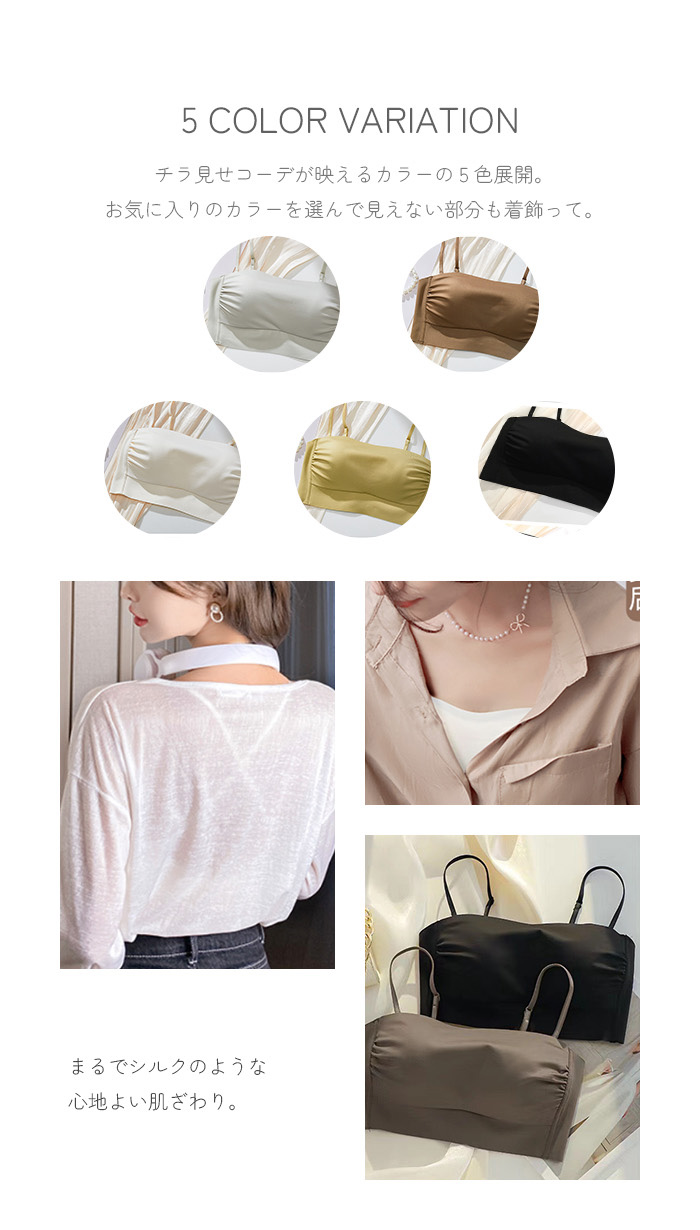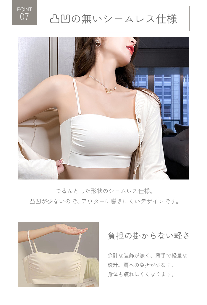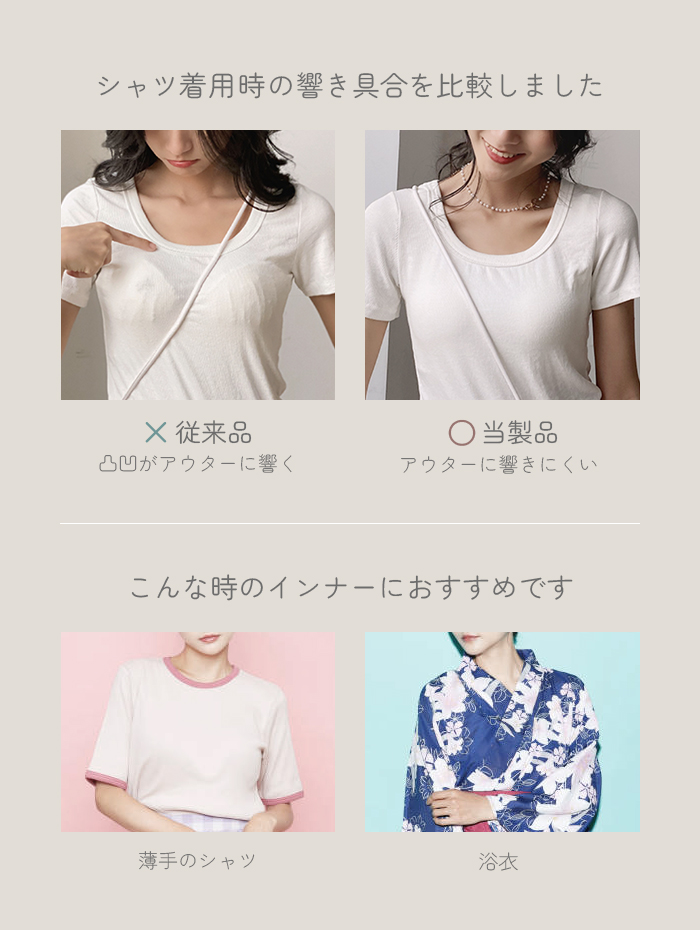 透けにくくなめらかな素材+チューブトップのようなデザインで、下着のラインが見えにくいので薄着でも安心です。