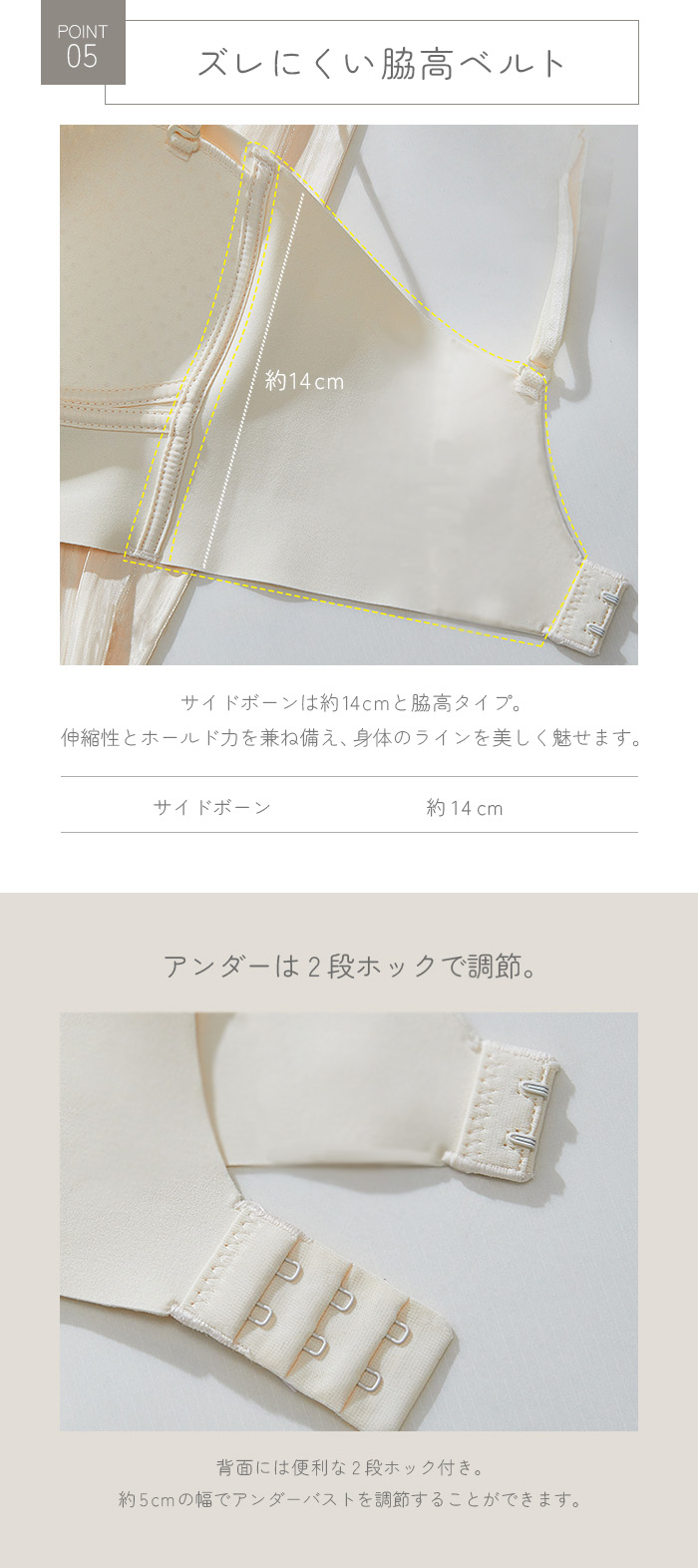 【脇高デザイン】脇の部分が14cmと幅広なので、横に流れてしまう胸や脇の肉をぎゅっと集めて収納。