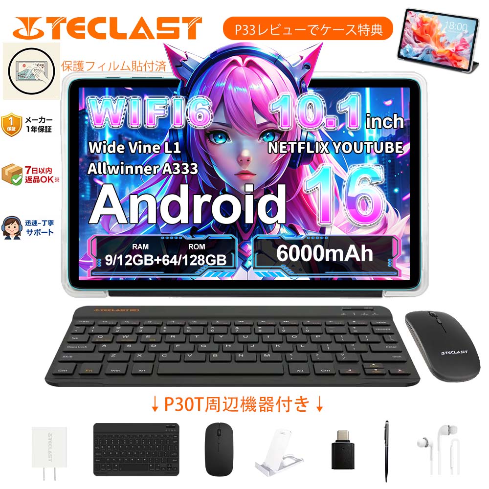 Android16/15★1000円OFFクーポン タブレット 10インチ TECLAST P30T 12GB RAM 128GB ROM P33 9GB RAM 64GB ROM Widevine L1 Wi-Fi 1年保証 【12時迄当日発送】