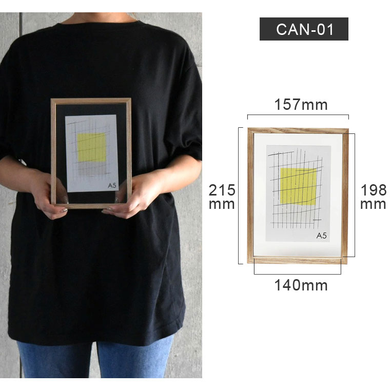 ガラスのサイズはW148xH210mmのA5サイズ(ガラスをフレームに差し込むと上下左右が少し隠れます)。