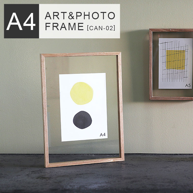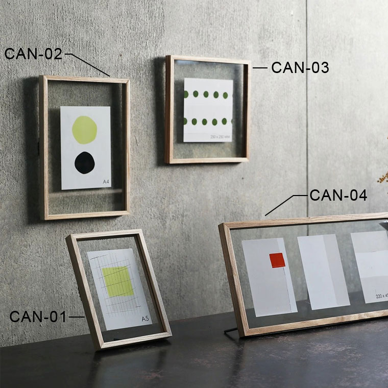 ★サイズ違いのフォトフレームはこちらCAN-01(A5サイズ:W157 x H215mm)CAN-03(正方形:W250 x H250mm)CAN-04(横長:W450 x H220mm)2枚のガラスで写真を挟む仕組みなので、写真立てとしてだけではなくお気に入りのポストカードや押し花をコラージュしても◎
