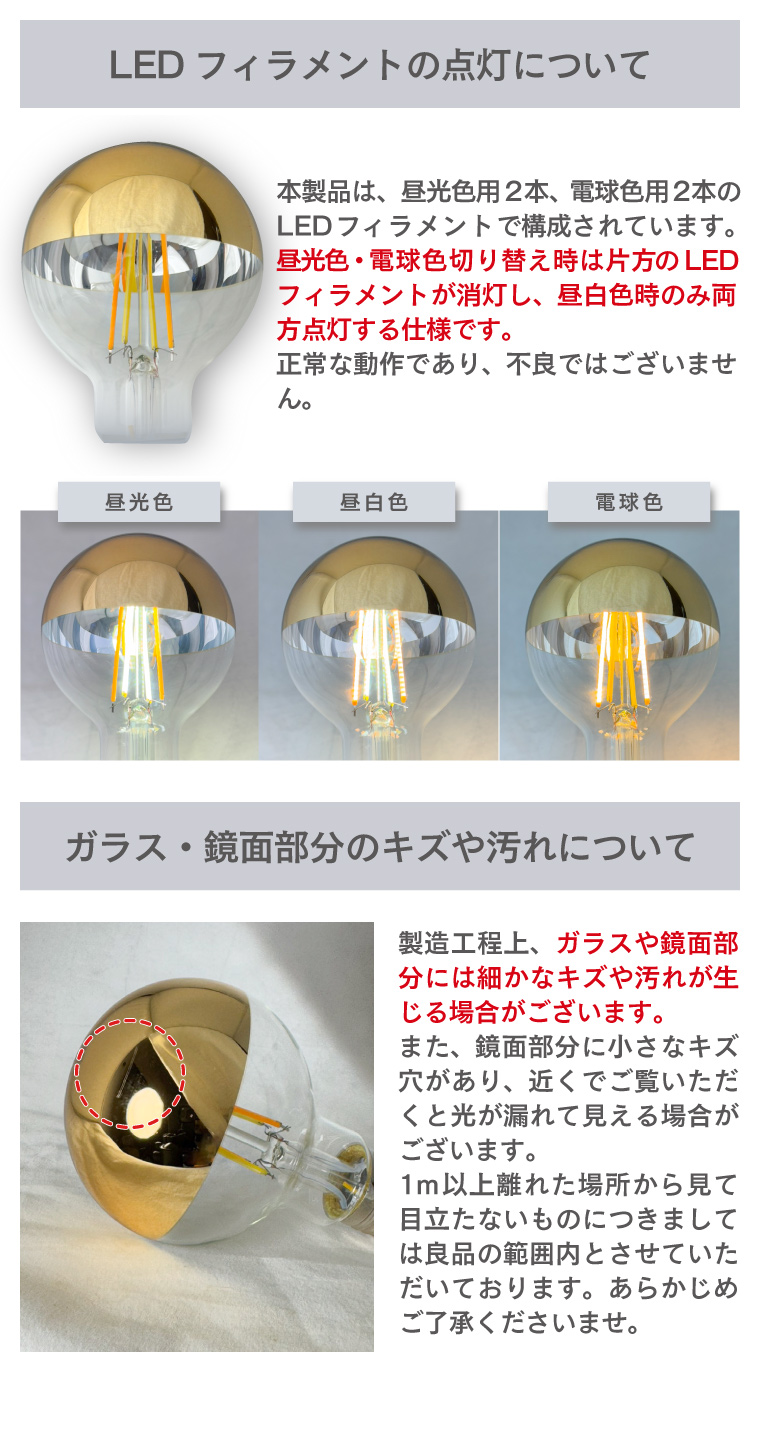 ※昼光色・電球色を切り替える際には、片方のフィラメントが消灯する仕様となっております。製品不良ではございませんので、あらかじめご了承ください。
