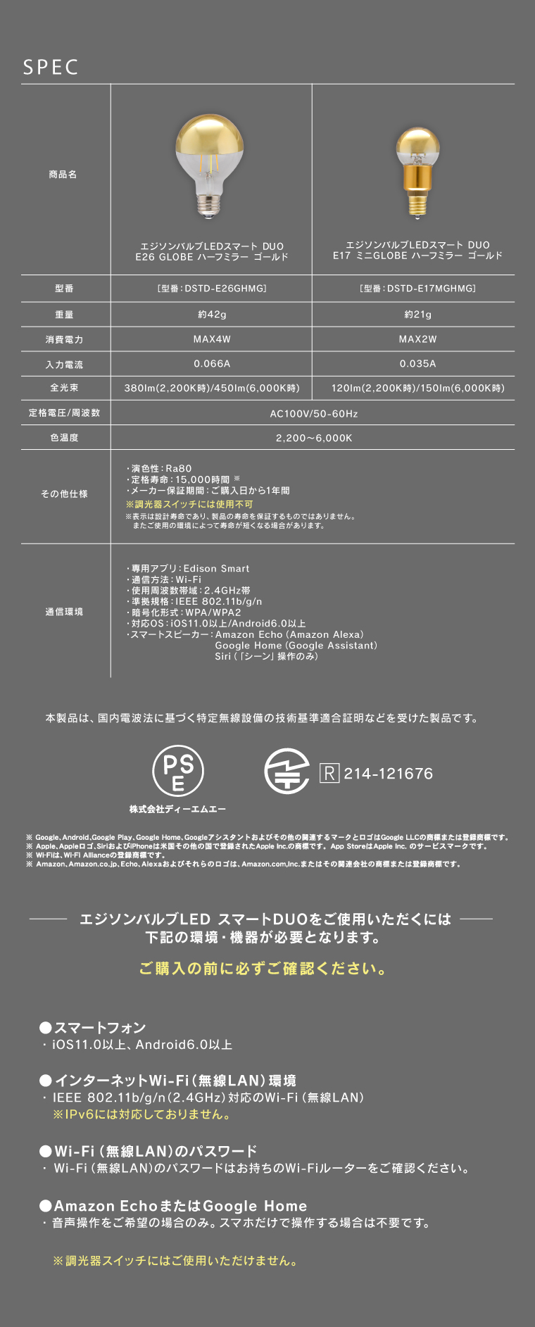 ※こちらの商品は調光機能付きのスイッチにはお取り付けいただけません。| 商品名 | エジソンバルブLEDスマート デュオ E26 GLOBE ハーフミラー ゴールド / E17 ミニGLOBE ハーフミラー ゴールド EDISON BULB LED SMART DUO E26 GLOBE HALF MIRROR GOLD / E17 MINI GLOBE HALF MIRROR GOLD |